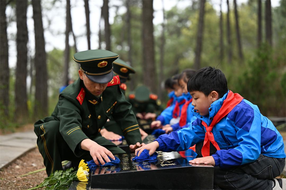 圖為官兵和學(xué)生們一起小心翼翼地擦拭烈士墓碑。