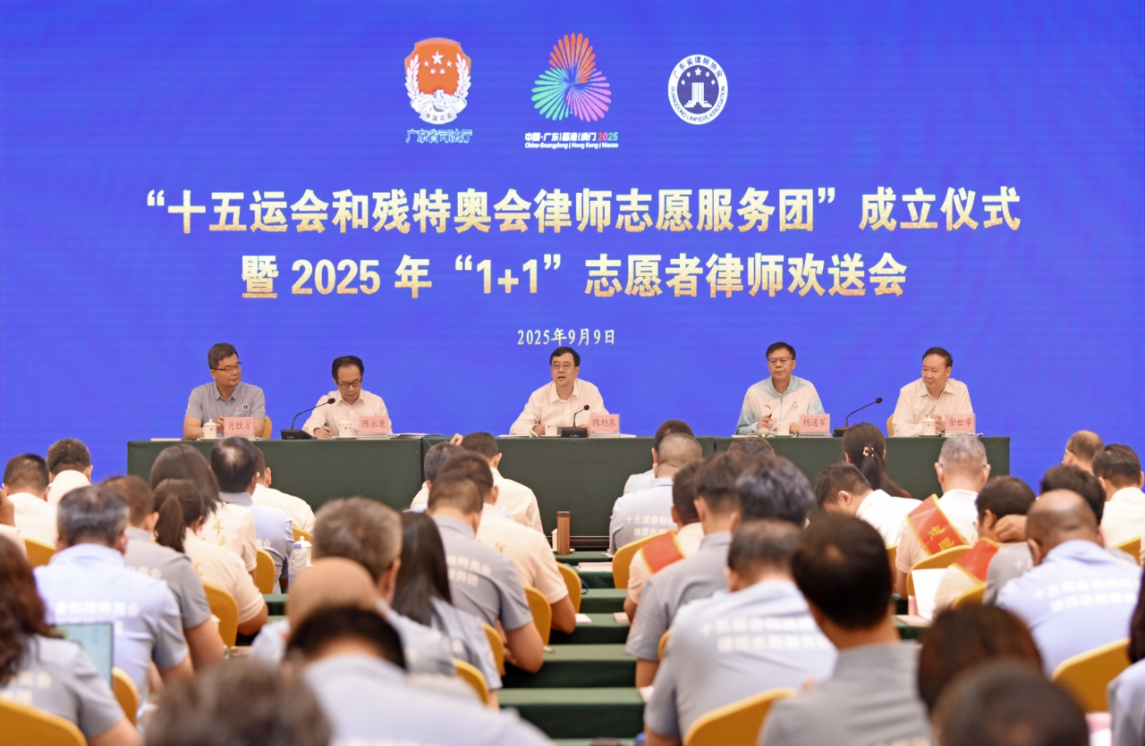 為全力保障“十五運(yùn)會和殘?zhí)貖W會”順利舉辦,廣東省律師協(xié)會積極響應(yīng)省委、省政府“當(dāng)好東道主”的號召,于9月9日在廣州正式成立“十五運(yùn)會和殘?zhí)貖W會律師志愿服務(wù)團(tuán)”,并舉行2025年“1+1”志愿者律師歡送會。廣東省司法廳黨委書記、廳長陳旭東出席儀式并講話,省司法廳黨委委員、副廳長陳永康主持活動。
