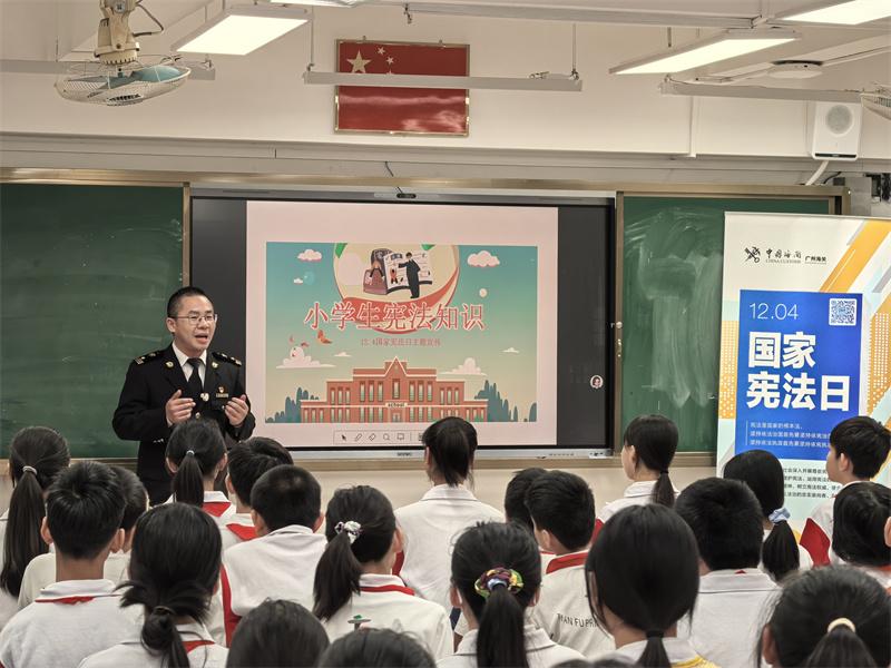12月3日下午,在位于廣東省廣州市天河區(qū)的天府路小學(xué)建業(yè)校區(qū)內(nèi),兩個六年級班級的共90多名學(xué)生正在聆聽一場內(nèi)容豐富、形式生動的憲法宣傳和國門安全教育課。