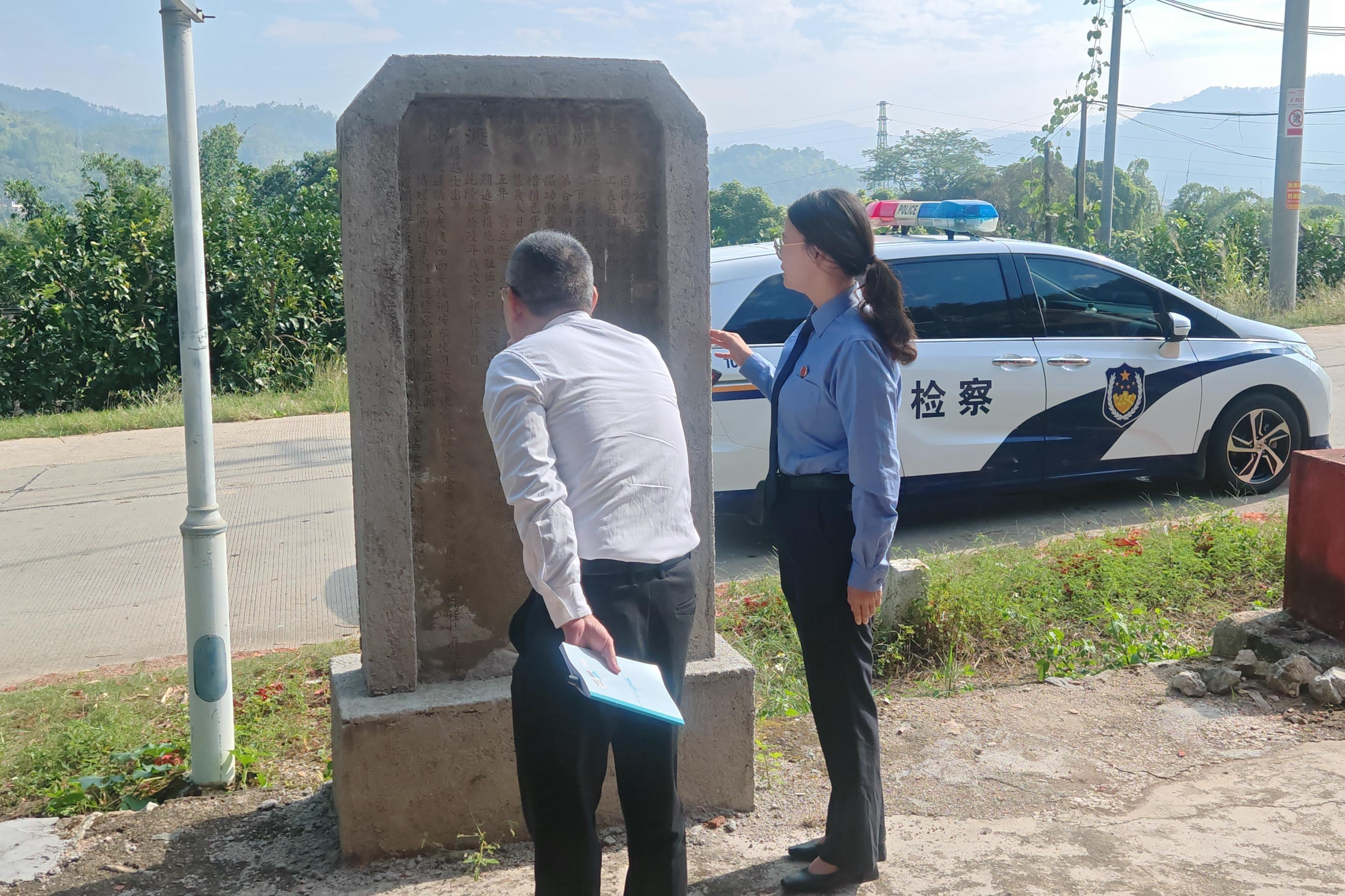 2025年3月,大埔縣人民檢察院接到群眾舉報(bào),反映百侯鎮(zhèn)多處清代石碑因缺乏保護(hù),遭自然侵蝕嚴(yán)重。辦案檢察官實(shí)地核查發(fā)現(xiàn),高約1.9米的“乾隆壬子稟生石楣桿”石碑被橫架水圳之上,碑面磨損、字跡模糊,而這塊石碑正是清代文人功名的實(shí)物見(jiàn)證,對(duì)研究客家科舉文化意義重大。