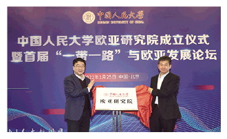 1月25日,中國(guó)人民大學(xué)歐亞研究院成立儀式暨首屆“一帶一路”與歐亞發(fā)展論壇召開(kāi)。中國(guó)人民大學(xué)校長(zhǎng)劉偉、黨委副書(shū)記鄭水泉、副校長(zhǎng)劉元春,中國(guó)國(guó)際文化交流中心秘書(shū)長(zhǎng)許紅海,中國(guó)社會(huì)科學(xué)院俄羅斯東歐中亞研究所所長(zhǎng)孫壯志,北京大學(xué)區(qū)域與國(guó)別研究院副院長(zhǎng)、國(guó)際關(guān)系學(xué)院教授翟崑,清華大學(xué)戰(zhàn)略與安全研究中心主任、社科院教授達(dá)巍,上海合作組織研究中心秘書(shū)長(zhǎng)、中國(guó)國(guó)際問(wèn)題研究院研究員鄧浩,民盟中央副主席、中國(guó)人民大學(xué)教授鄭功成以及有關(guān)部委司局級(jí)領(lǐng)導(dǎo)、學(xué)校相關(guān)單位負(fù)責(zé)人、專(zhuān)家學(xué)者共60余人出席成立儀式暨論壇開(kāi)幕式。