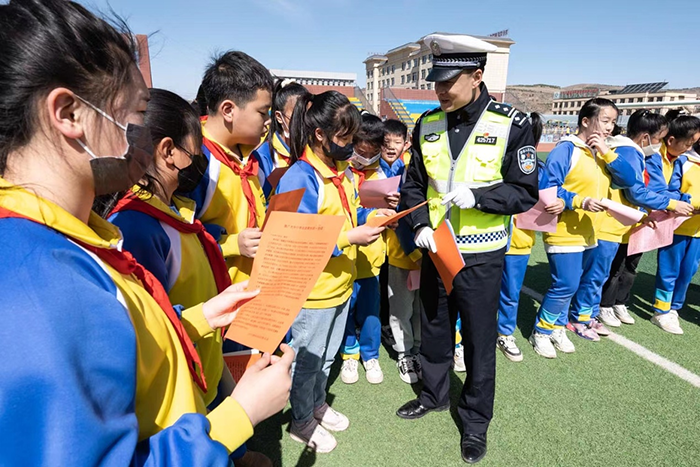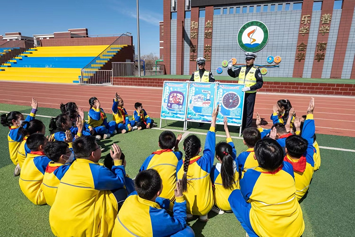 在經(jīng)棚民族實(shí)驗(yàn)小學(xué),民警現(xiàn)場(chǎng)發(fā)放交通安全宣傳資料,講解交通安全知識(shí),與學(xué)生們開展現(xiàn)場(chǎng)互動(dòng)交流。活動(dòng)最后,民警還帶領(lǐng)師生共同宣誓,共同倡議文明交通,安全出行。(宿海東)