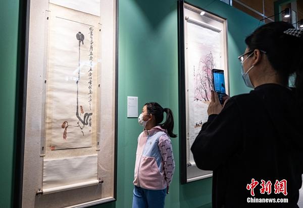 4月13日,市民在北京榮寶齋欣賞在此舉辦的“南張北齊——張大千齊白石書畫藝術(shù)特展”。本次特展精選張大千與齊白石一生早、中、晚三個(gè)時(shí)期,近五十件(組)佳作,完整地涵蓋了兩位世紀(jì)巨匠各個(gè)時(shí)期的創(chuàng)作面貌。圖為家長帶小朋友參觀齊白石《仿八大山人鳥木圖》。中新社記者 侯宇 攝