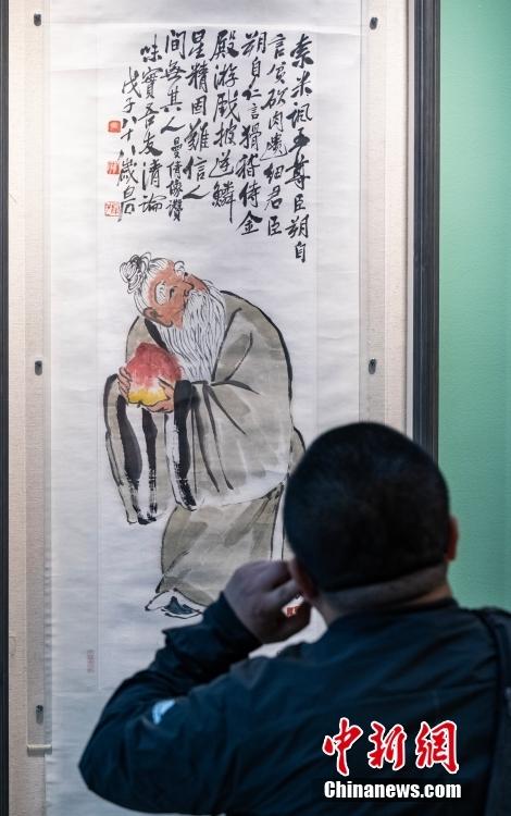 4月13日,市民在北京榮寶齋欣賞在此舉辦的“南張北齊——張大千齊白石書畫藝術(shù)特展”。本次特展精選張大千與齊白石一生早、中、晚三個(gè)時(shí)期,近五十件(組)佳作,完整地涵蓋了兩位世紀(jì)巨匠各個(gè)時(shí)期的創(chuàng)作面貌。圖為齊白石《東方朔盜桃圖》吸引一位男士駐足欣賞。中新社記者 侯宇 攝