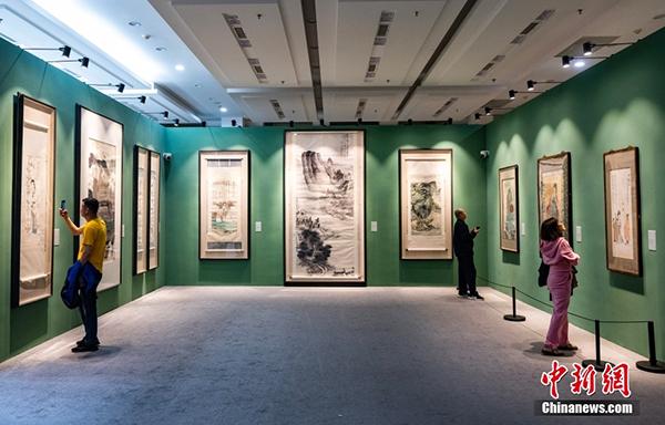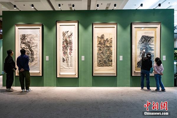 4月13日,市民在北京榮寶齋欣賞在此舉辦的“南張北齊——張大千齊白石書畫藝術(shù)特展”。本次特展精選張大千與齊白石一生早、中、晚三個(gè)時(shí)期,近五十件(組)佳作,完整地涵蓋了兩位世紀(jì)巨匠各個(gè)時(shí)期的創(chuàng)作面貌。圖為觀眾參觀齊白石《梅石圖》《荔枝圖》(左一、左二)和張大千《夏山高隱圖》《峨眉接引殿》(右二、右一)。中新社記者 侯宇 攝