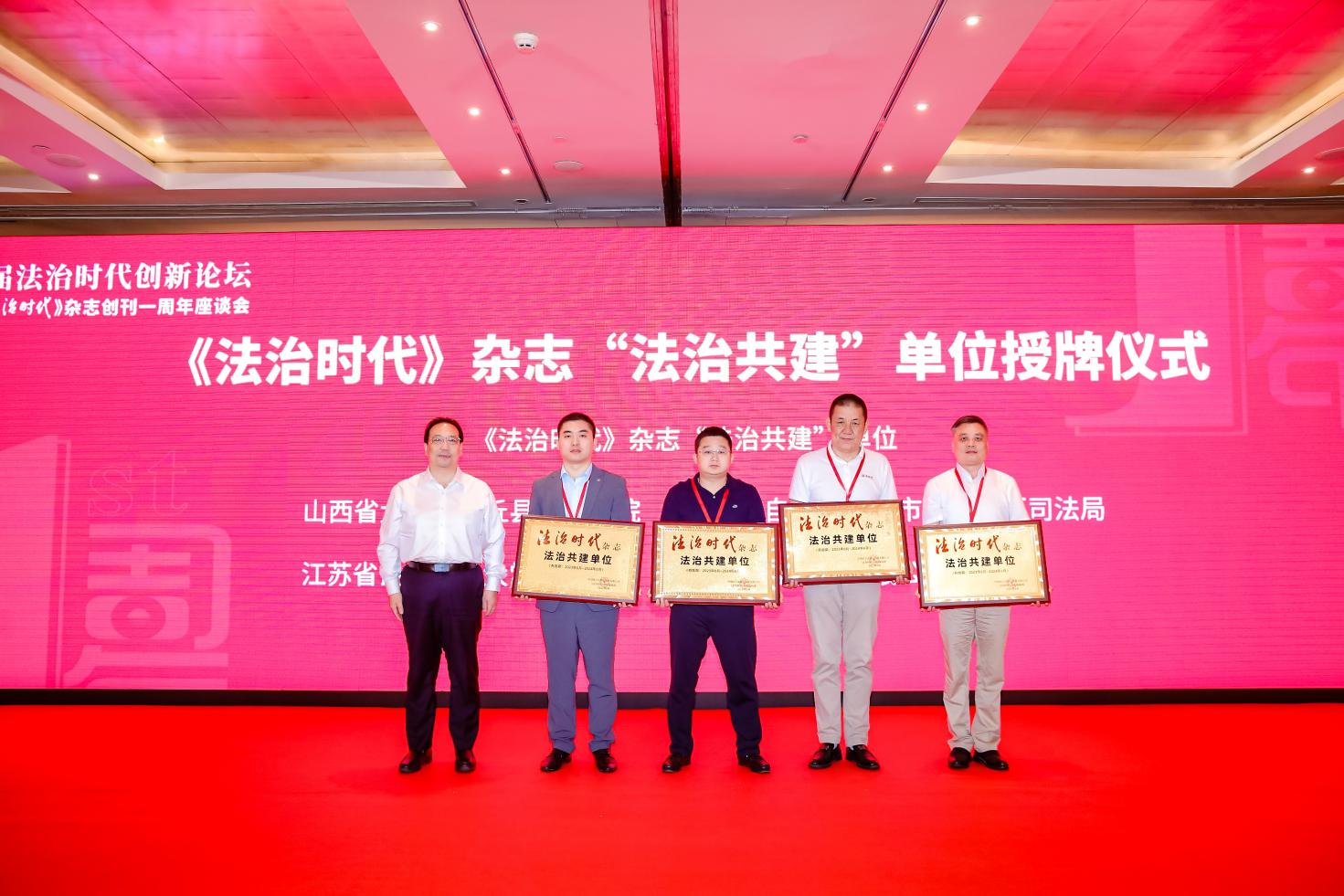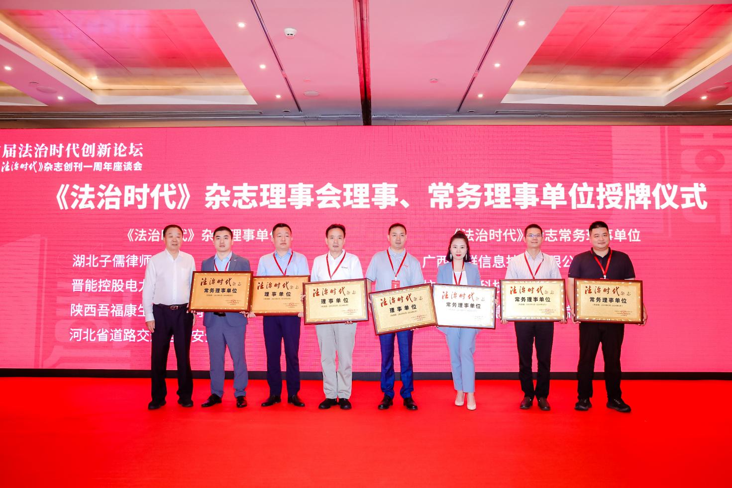 主旨演講環(huán)節(jié)結束后,進行了《法治時代》雜志理事會理事單位、常務理事單位、《法治時代》雜志“法治共建”單位聘任儀式。第十二屆全國人大法律委主任委員喬曉陽、中國出版集團有限公司總經理、黨組副書記常勃分別為理事單位、常務理事單位和“法治共建”單位授牌。