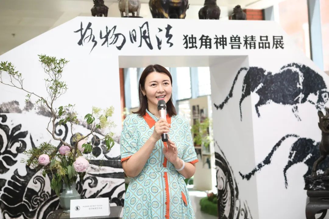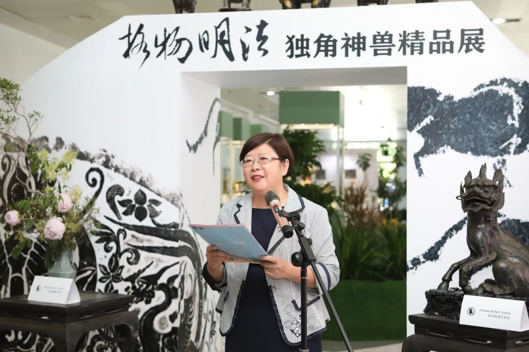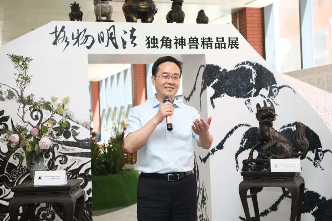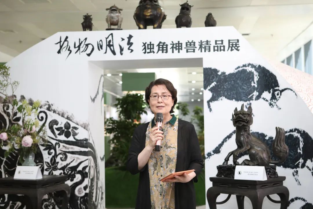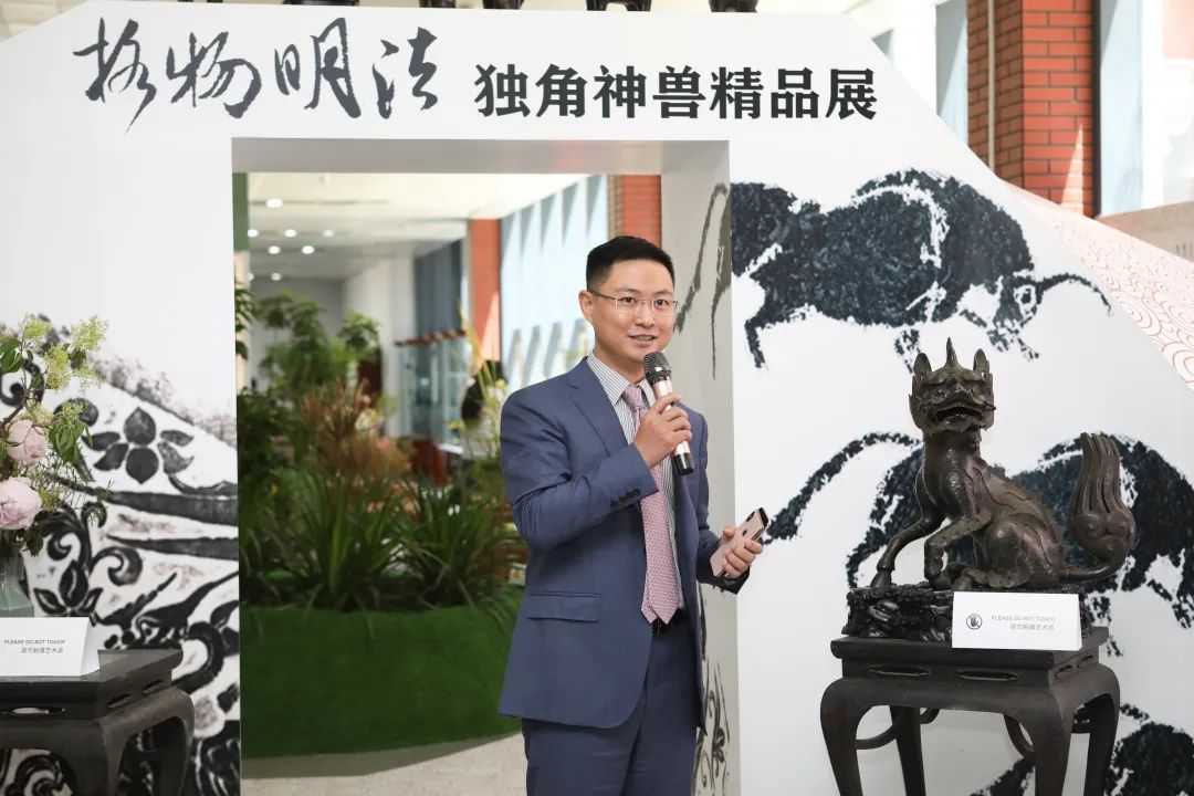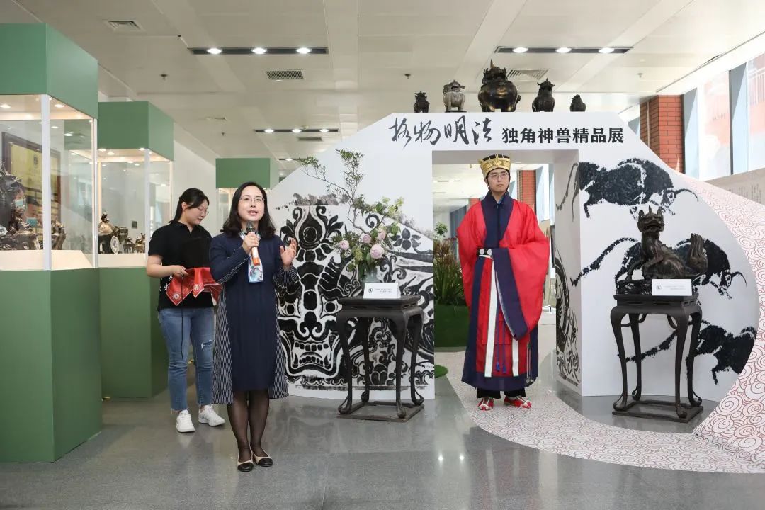 本次展覽的策展人、學(xué)術(shù)主持李雪梅教授向大家介紹了策展理念。中國(guó)有著源遠(yuǎn)流長(zhǎng)的獨(dú)角崇拜與祥瑞崇拜,創(chuàng)造了形制各異的獨(dú)角神獸,而其中與法律聯(lián)系最為緊密的就是獬豸。獬豸代表了公平正義的執(zhí)法理念,她希望從事法學(xué)教育和法律實(shí)務(wù)的人士及其后備軍心里駐有這只神獸,時(shí)刻提醒、鞭策自己。她介紹本次展覽有很多亮點(diǎn),最大的亮點(diǎn)是復(fù)制了獬豸冠并首次在高校校園中展示,體現(xiàn)了展覽的學(xué)術(shù)追求和育人意義;其次是將時(shí)間跨度2000余年、近百種的神獸匯聚一處,在國(guó)內(nèi)也尚屬首次;三是展覽設(shè)計(jì)以鳳凰形象為基調(diào)布置綠植花卉,配以鹿、鶴等標(biāo)本和雅致的音樂(lè),營(yíng)造出神獸在花園中憩息的祥和景觀。展覽給觀眾提供了一個(gè)欣賞、探究和發(fā)現(xiàn)的場(chǎng)景,希望大家在觀賞中能找到自己心目中的那只理想的獬豸。