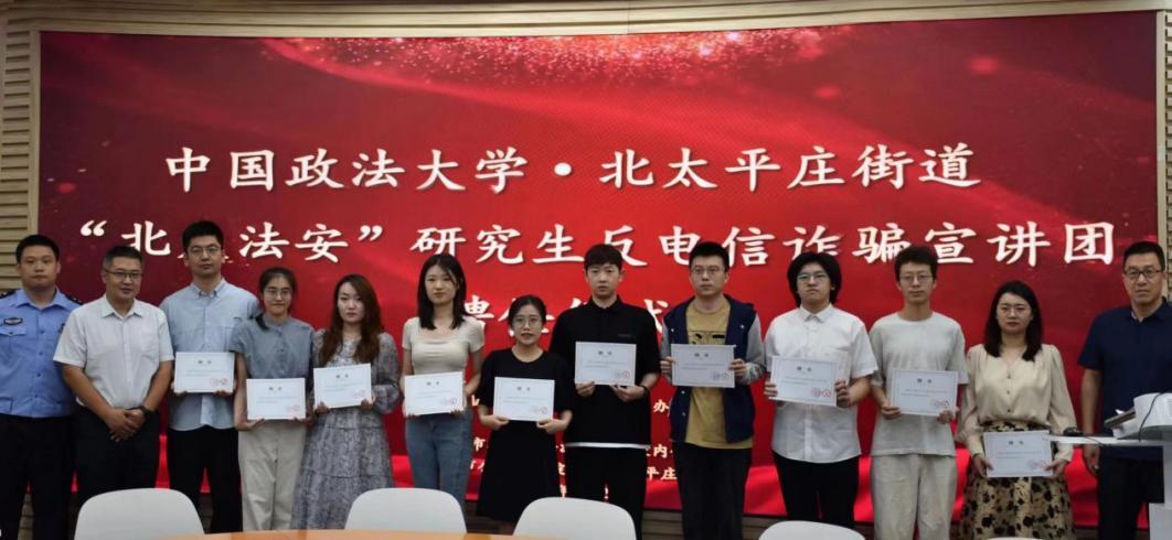為進(jìn)一步加強(qiáng)與完善研究生社會實(shí)踐育人體系,引導(dǎo)和鼓勵中國政法大學(xué)研究生發(fā)揮專業(yè)優(yōu)勢,深入基層實(shí)踐,服務(wù)基層法治建設(shè),今年3月,中國政法大學(xué)研究生工作辦公室、刑事司法學(xué)院聯(lián)合北京市公安局海淀分局北太平莊派出所共同組建“北太法安”中國政法大學(xué)研究生反電信詐騙宣講團(tuán)。6月28日,"北太法安"研究生反電信詐騙宣講團(tuán)聘任儀式在中國政法大學(xué)學(xué)院路校區(qū)舉行。
