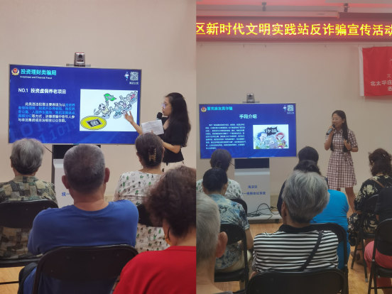 宣講團(tuán)成員王舒琦、李成秀在北京市海淀區(qū)北太平莊街道明光北里社區(qū)的社區(qū)活動中為老年人們進(jìn)行了防范養(yǎng)老詐騙宣傳。兩位同學(xué)結(jié)合類型分析與實務(wù)案例,重點介紹了誘導(dǎo)消費類、投資理財類、養(yǎng)老保險類等典型騙局的詐騙方式,分享了針對性的防范路徑與預(yù)防措施,并給出了具體的防范建議。兩位同學(xué)的講解幫助老年人充分認(rèn)識到防范詐騙的重要性,樹立了反詐意識,了解了防詐知識。