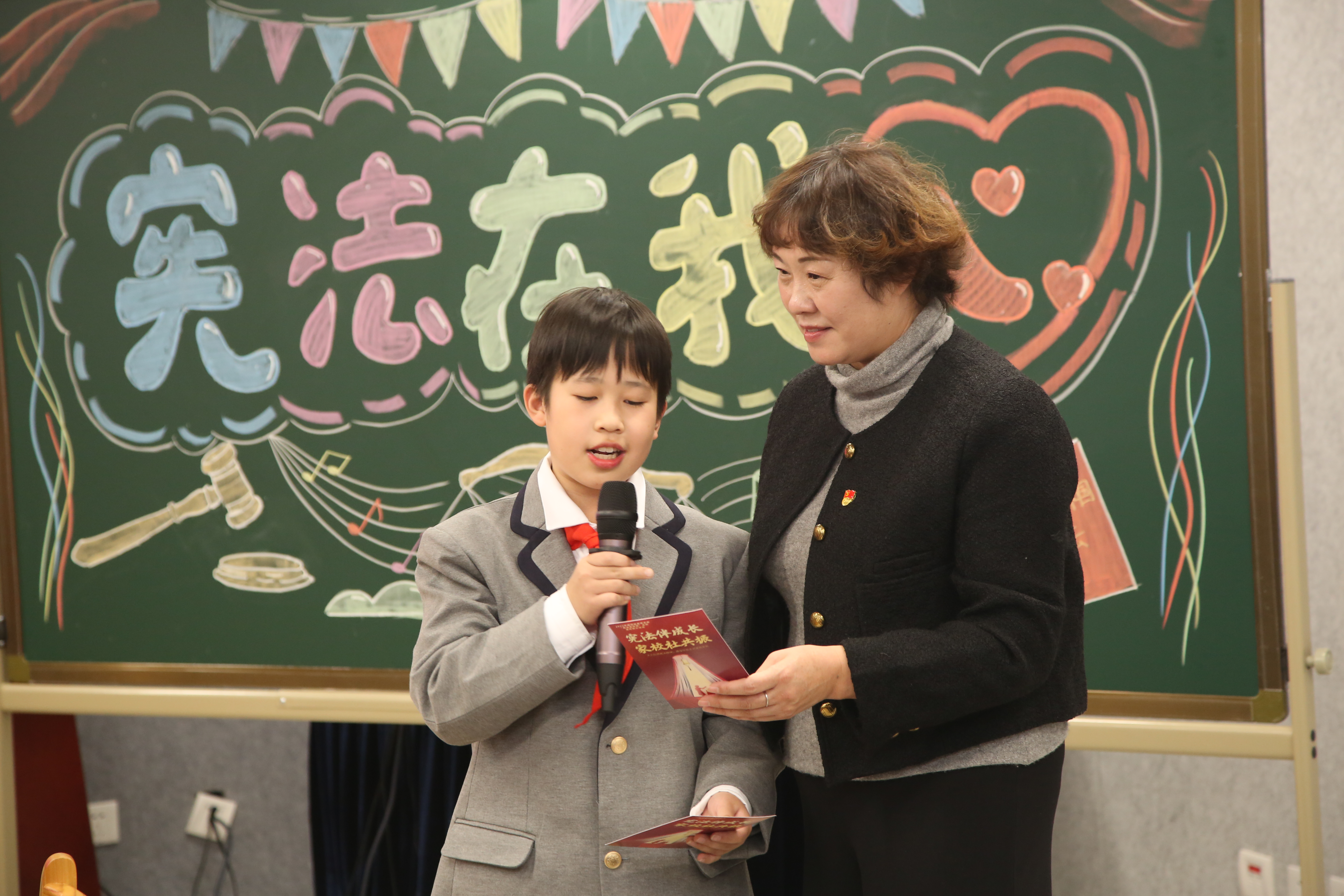 “憲法伴成長(zhǎng) 家校社共振”主題活動(dòng)現(xiàn)場(chǎng),北京市朝陽(yáng)區(qū)高家園小學(xué)果春平書記與學(xué)生分享憲法名片。