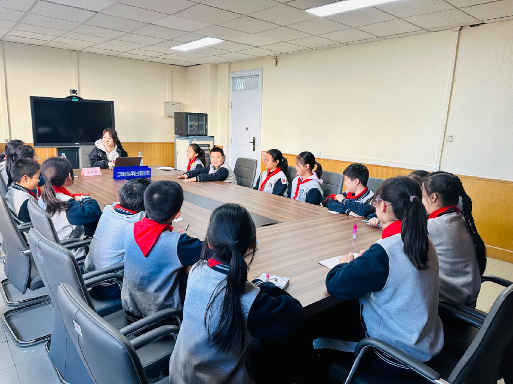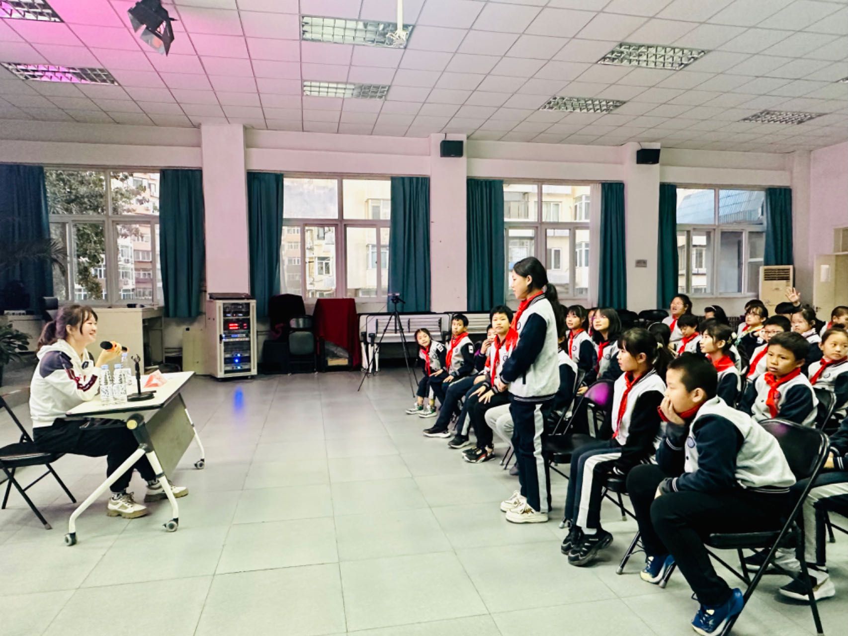 北京大學(xué)法學(xué)院丁葉萱與北京市朝陽(yáng)區(qū)芳草地國(guó)際學(xué)校甘露園分校小學(xué)部甘露校區(qū)學(xué)生進(jìn)行法律知識(shí)座談會(huì)。