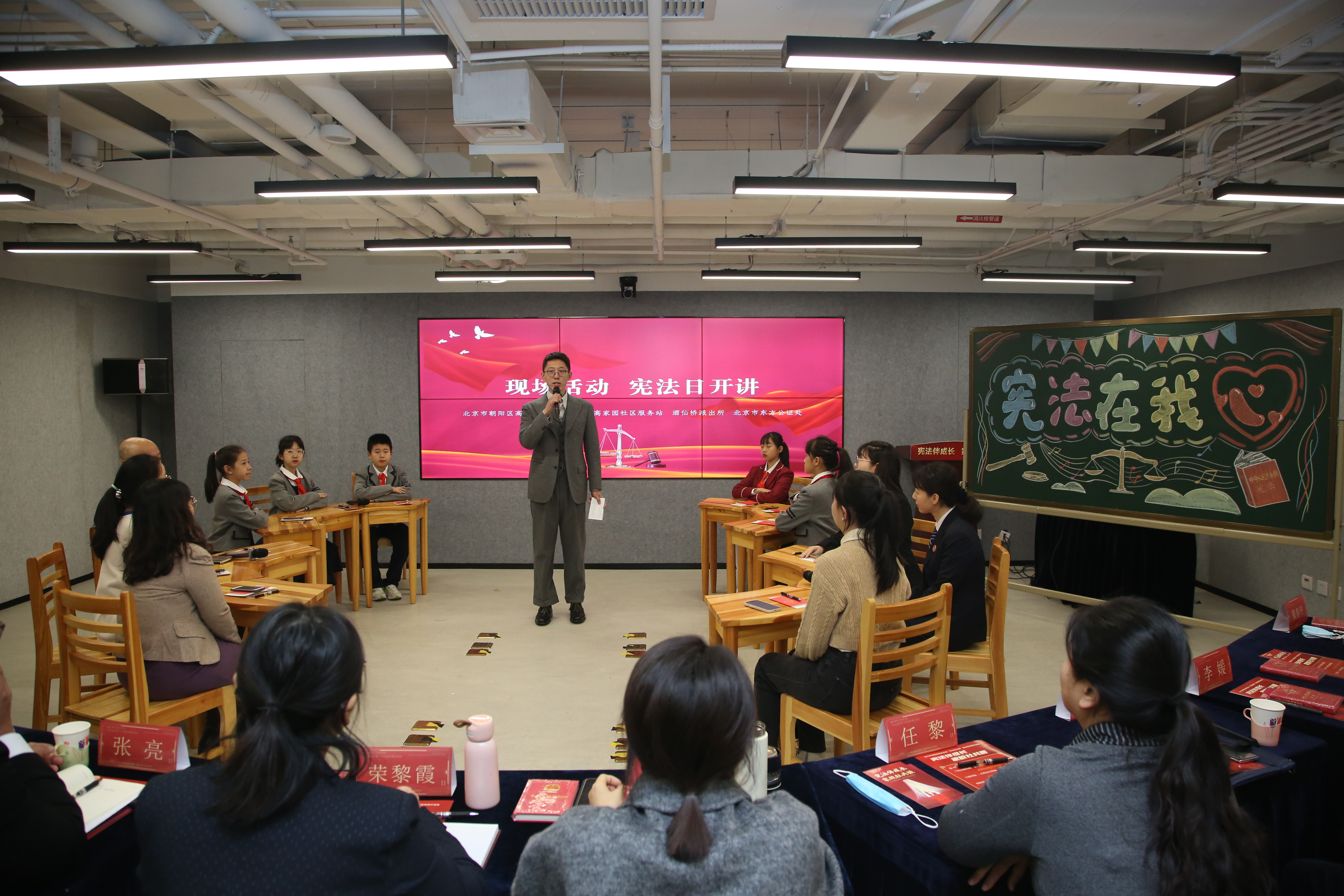 12月3日,北京市朝陽(yáng)區(qū)高家園小學(xué)與將臺(tái)路小學(xué)及社區(qū)聯(lián)手,共同舉辦了“憲法伴成長(zhǎng) 家校社共振”主題現(xiàn)場(chǎng)活動(dòng)。高家園小學(xué)張弜老師帶領(lǐng)大家走進(jìn)憲法“講堂”。