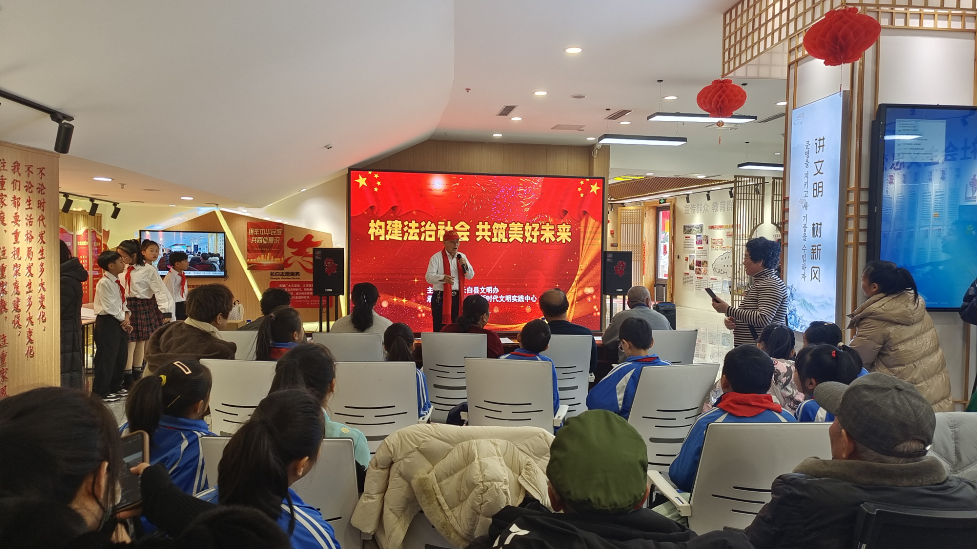 為增強學生的法律意識,不斷凝聚奮進力量,扎實有效開展新時代法治宣傳教育。長白縣委宣傳部、縣文明辦組織文明實踐志愿服務隊在新時代文明實踐中心(所、站)開展“構建法治社會共筑美好未來”文藝活動,以寓教于樂的方式,讓在場的同學們品嘗了一道豐盛的法治文化大餐。
