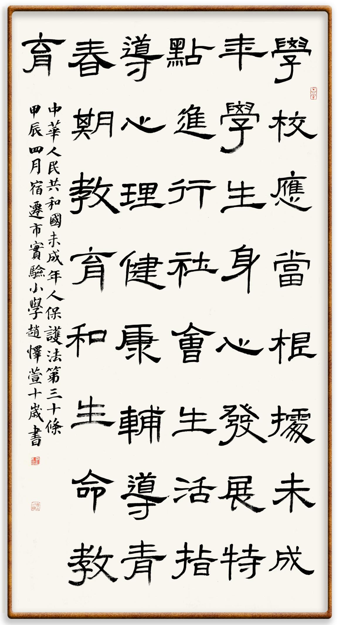 “六一”國際兒童節(jié)來臨之際,法制日報社聯(lián)合(全國)教育書畫協(xié)會基礎(chǔ)書法教育分會,推出“‘書·法’系列活動之書寫《中華人民共和國未成年人保護法》活動”,邀請小朋友書寫部分法條,讓孩子們在濃濃的節(jié)日氛圍中感受傳統(tǒng)文化的獨特魅力。