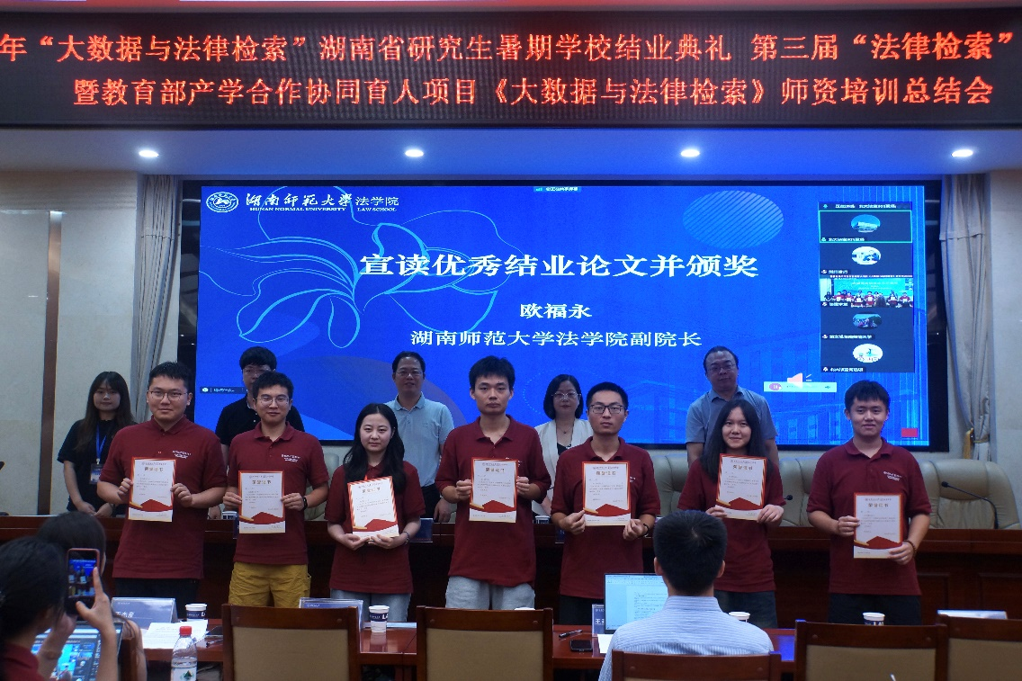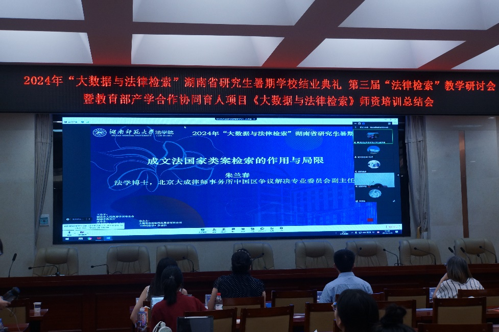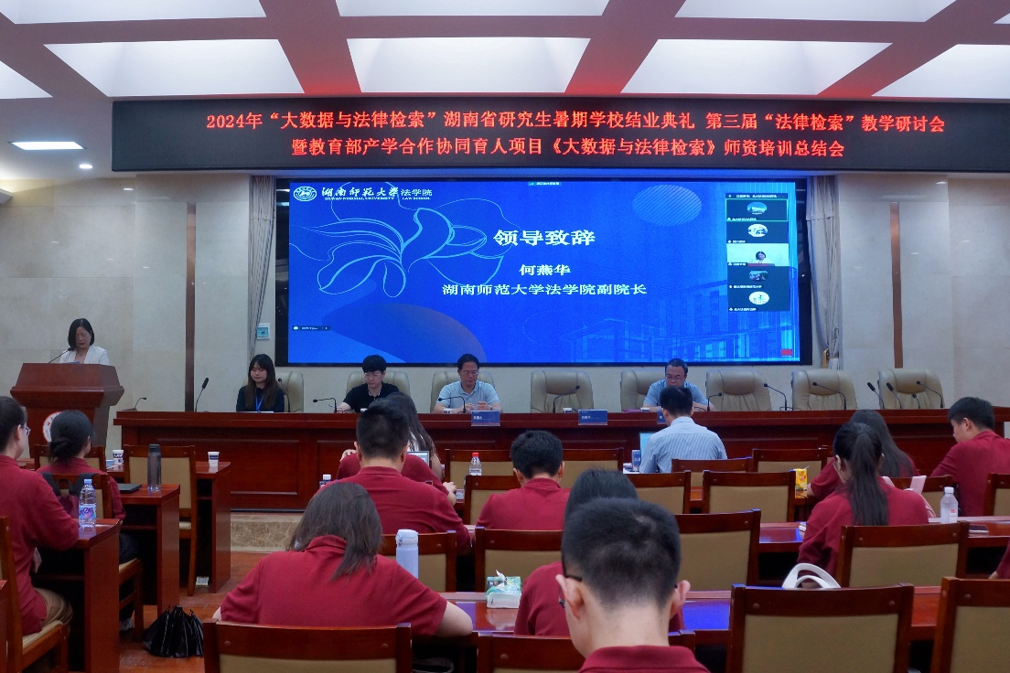 7月28日上午,2024“大數(shù)據(jù)與法律檢索”湖南省研究生暑期學(xué)校結(jié)業(yè)典禮、第三屆“法律檢索”教學(xué)研討會暨教育部產(chǎn)學(xué)合作協(xié)同育人項目《大數(shù)據(jù)與法律檢索》師資培訓(xùn)總結(jié)會在湖南師范大學(xué)法學(xué)院舉行,湖南師范大學(xué)法學(xué)院副院長何燕華、湖南師范大學(xué)法學(xué)院副院長歐福永、湖南師范大學(xué)法學(xué)院副教授黃文旭、本次暑期學(xué)校班主任李部(北大法寶學(xué)堂)、湖南師范大學(xué)法學(xué)院法碩辦輔導(dǎo)員羅昊、大連財經(jīng)學(xué)院教師王杰彥、武漢東湖學(xué)院教師王建東、大連海事大學(xué)法學(xué)院教師吳淞豫及線上嘉賓廣東外語外貿(mào)大學(xué)教授曾赟、北大法寶副總經(jīng)理何遠瓊博士出席本次結(jié)業(yè)典禮。湖南師范大學(xué)法學(xué)院研究生工作辦公室主任王丹主持本次結(jié)業(yè)典禮。