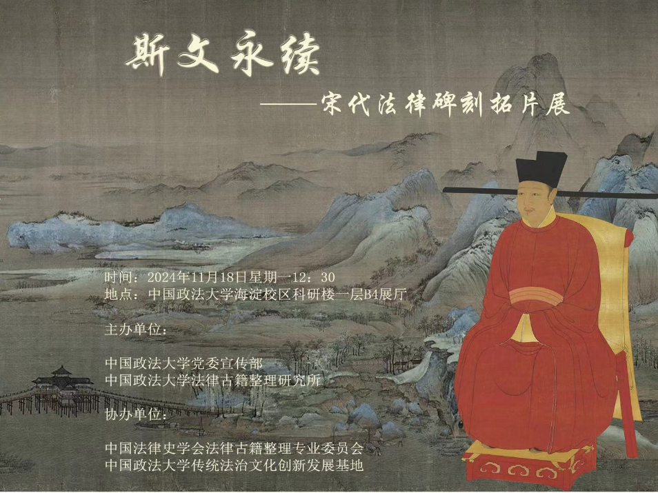 2024年11月18日,“斯文永續(xù)——宋代法律碑刻拓片展”在中國政法大學(xué)海淀校區(qū)開幕。本次展覽由中國政法大學(xué)黨委宣傳部、中國政法大學(xué)法律古籍整理研究所主辦,中國法律史學(xué)會(huì)法律古籍整理專業(yè)委員會(huì)、中國政法大學(xué)傳統(tǒng)法治文化創(chuàng)新發(fā)展基地協(xié)辦。這是自2017年以來中國政法大學(xué)舉辦第13場法制文物學(xué)術(shù)公益展覽。
