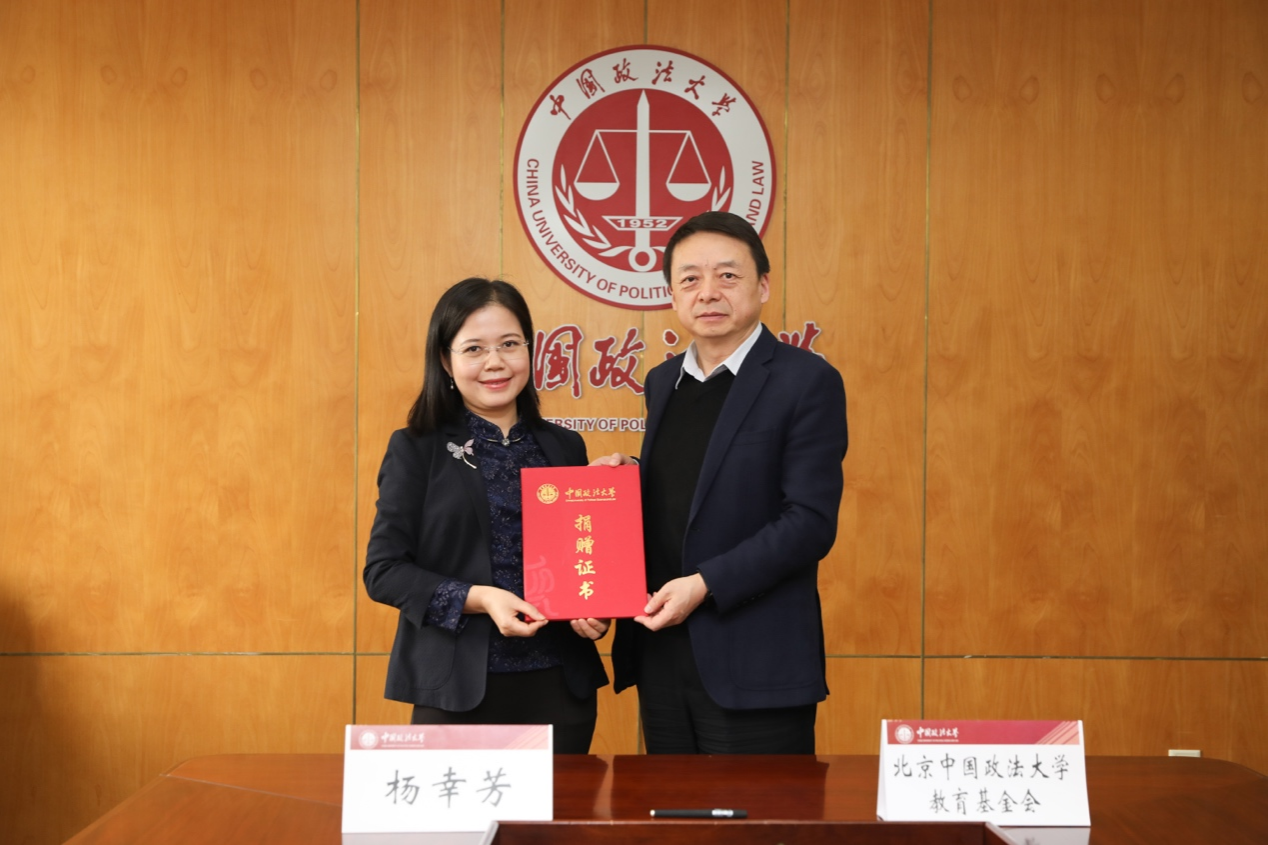 盧春龍代表中國(guó)政法大學(xué)和楊幸芳簽署捐贈(zèng)協(xié)議,馬懷德代表中國(guó)政法大學(xué)向楊幸芳頒發(fā)捐贈(zèng)證書(shū)。