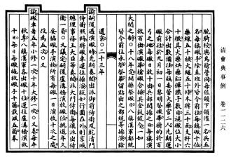 “事例”原指先前存在的成例。在中國(guó)古代,事例對(duì)后發(fā)類案之處置,多具指導(dǎo)意義。西晉時(shí),楊駿以謀反之罪見(jiàn)誅,其弟楊珧雖陳情自告仍受牽連。“當(dāng)時(shí)皆謂宜為申理,合依鐘繇事例”,時(shí)人援引鐘繇免于鐘會(huì)之誅事,欲援救楊珧。逮至明代,“事例”已表現(xiàn)出與會(huì)典的密切聯(lián)系。《萬(wàn)歷會(huì)典》載,“其近年六部等衙門(mén)見(jiàn)行事例,各令選委司屬官,遵照體例,分類編集”。洎乎清代,“會(huì)典事例”作為一種法律形式繼續(xù)發(fā)展?!犊滴鯐?huì)典》率先厘定“事例”的類型。乾隆時(shí),認(rèn)為“夫例可通,典不可變”,典與例當(dāng)分離。遂在制定《大清會(huì)典》之余,另編《大清會(huì)典則例》180卷。嘉慶朝在編纂《大清會(huì)典》之外,又有《大清會(huì)典事例》920卷、《欽定大清會(huì)典圖》132卷。至此,“會(huì)典事例”以一種法律形式獨(dú)立于“會(huì)典”存在。
