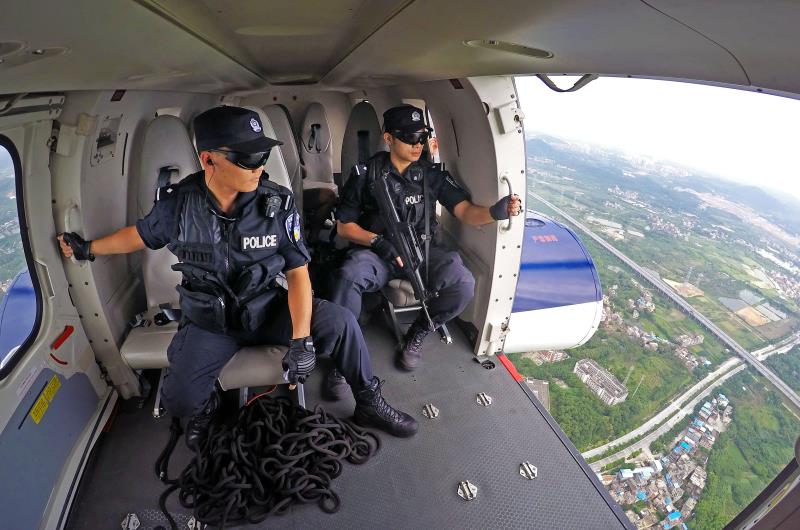為進(jìn)一步完善“水、陸、空”立體化治安防控格局,廣東省廣州市警方專門成立警務(wù)飛行巡邏專業(yè)隊(duì)伍,通過(guò)直升飛機(jī)搭載特警力量開展空中巡邏防控,與地面、水上巡邏防控力量聯(lián)勤聯(lián)動(dòng)。圖為4月9日,廣州特警使用警用直升機(jī)開展“地上+空中”巡邏防控?! ?/p>