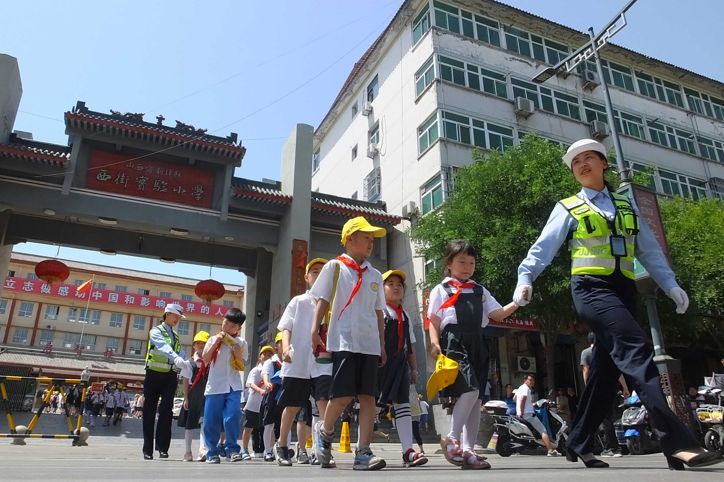 6月3日,山西運城市新絳縣公安交警大隊古城中隊的交警們在西街實驗小學(xué)大門前接力護送中午放學(xué)的小學(xué)生安全過馬路。 新絳縣作為山西省教育大縣,護送中小學(xué)生安全上下學(xué)已成為當?shù)亟痪囊豁椚粘9ぷ鳌km然幾十年中交警換了一茬又一茬,好多交警已退休,但“接力護航”的接力棒在一批批交警手中傳遞,確保了幾十年來無一起重特大中小學(xué)生交通事故發(fā)生。