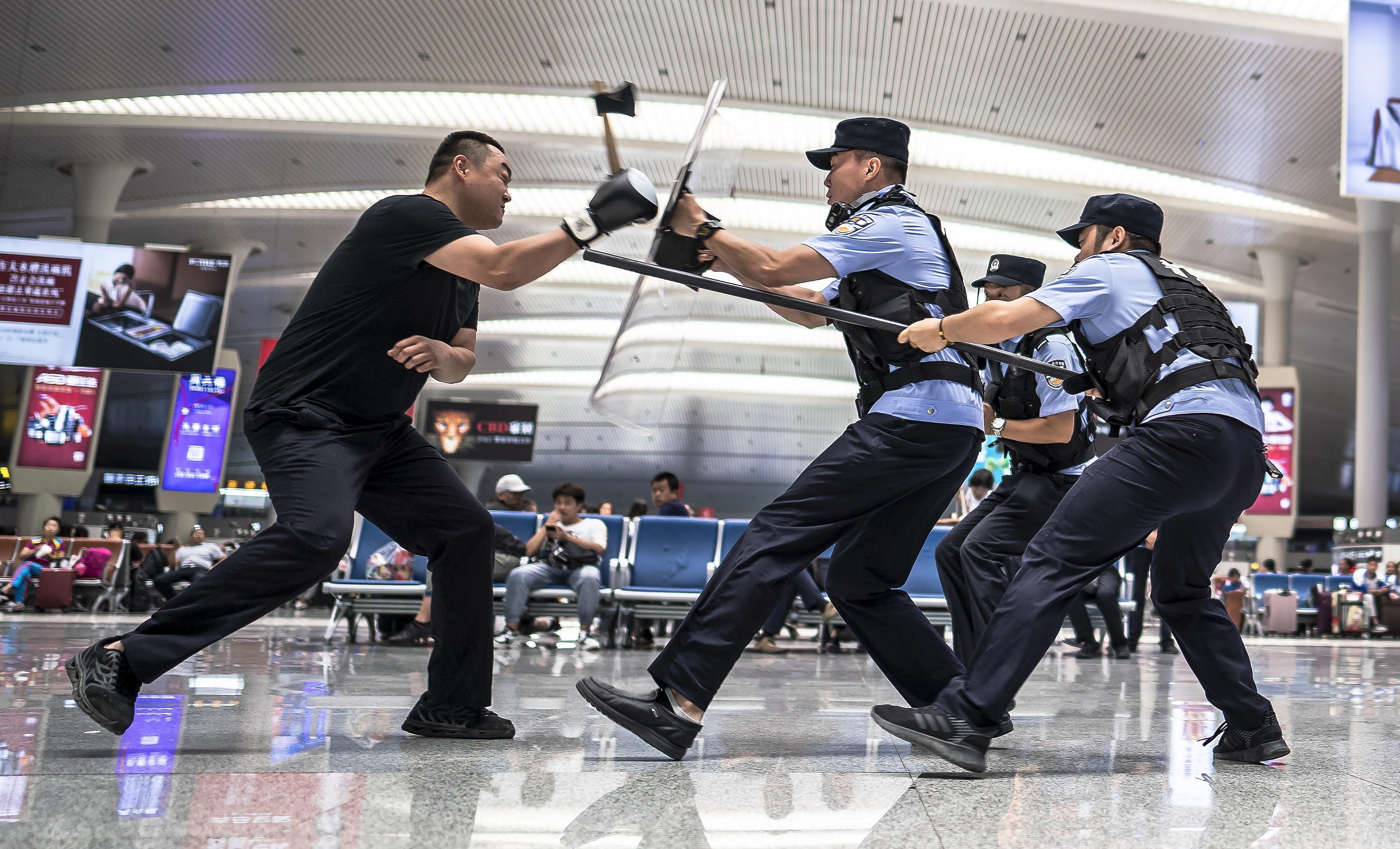 為切實提高一線民警的反恐防暴應急處突能力,8月26日上午,烏魯木齊鐵路公安處烏魯木齊站派出所緊結(jié)合“平安站車路、金盾護你行”專項活動,緊密圍繞近期暑運大客流以及學生返校高峰,立足站車反恐維穩(wěn)工作實際,有針對性地開展了實戰(zhàn)大練兵活動。以車站候車室突然發(fā)生刀斧砍殺為警情,駐站快速反應小分隊接到警情后,在50秒內(nèi)迅速趕赴事發(fā)地點,面對“暴徒”,處置民警根據(jù)現(xiàn)場緊急狀況立即開槍擊傷“暴徒”果斷處置,通過此次演練進一步提高了應急處突小組在緊急情況下對突發(fā)恐怖襲擊的快速反應能力,達到預期目的。