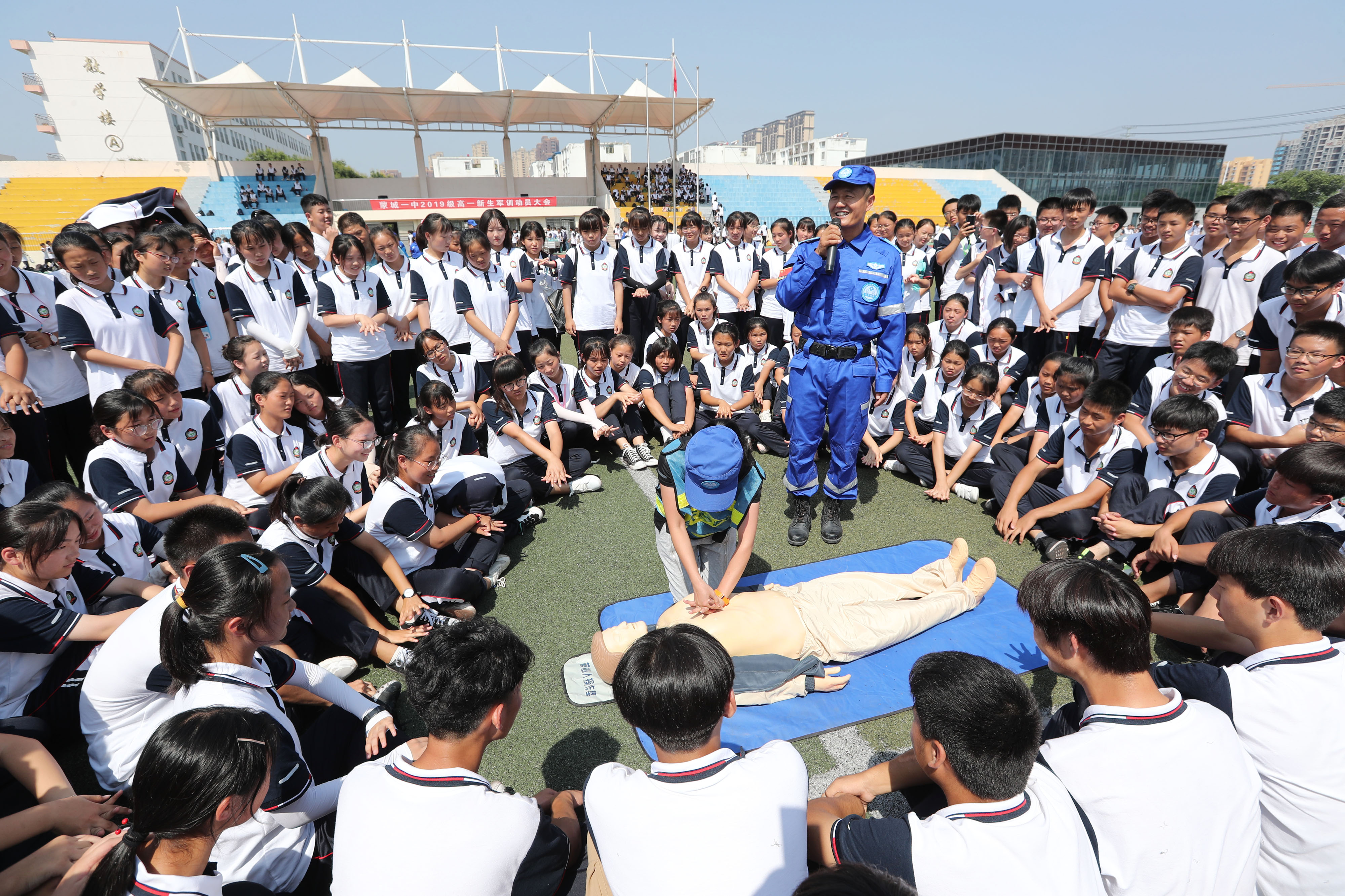 8月29日,安徽省蒙城縣第一中學(xué)操場,志愿者向高一新生演示介紹心腹復(fù)蘇急救要領(lǐng)。