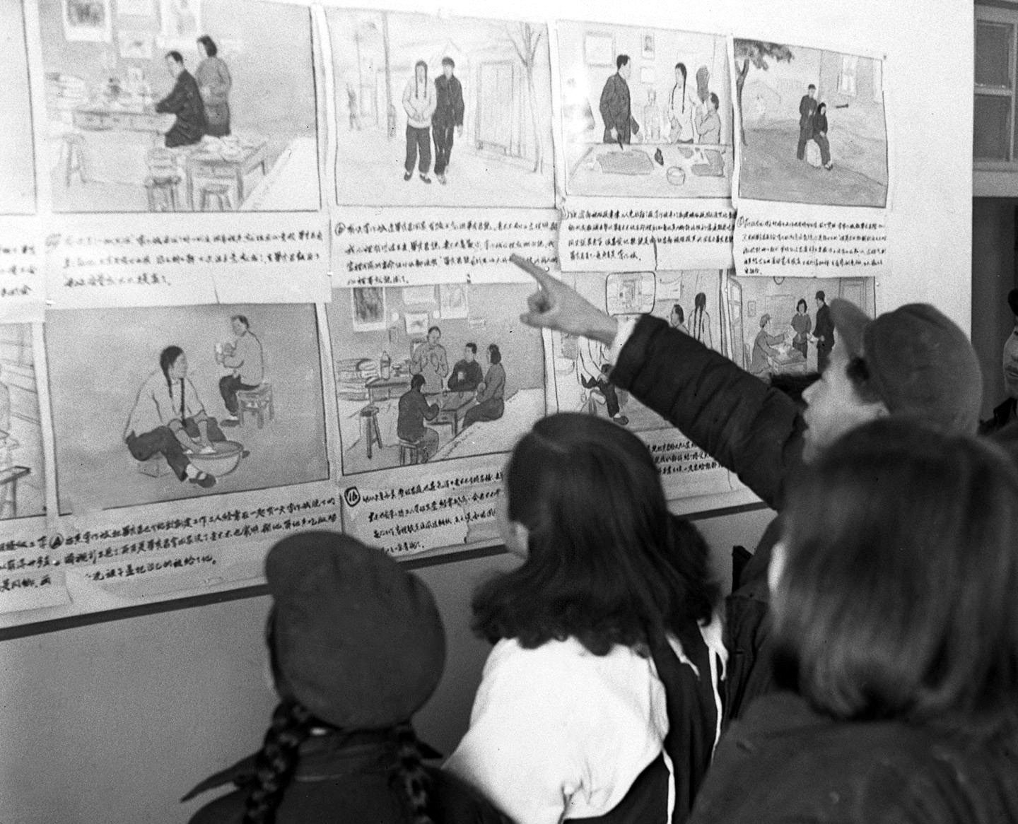 北京被服廠第四縫紉部是貫徹婚姻法的試點部門,青年李作斌自由戀愛及建立民主和睦家庭的經(jīng)過,被以連環(huán)畫的形式張貼出來(1953年4月2日攝)。