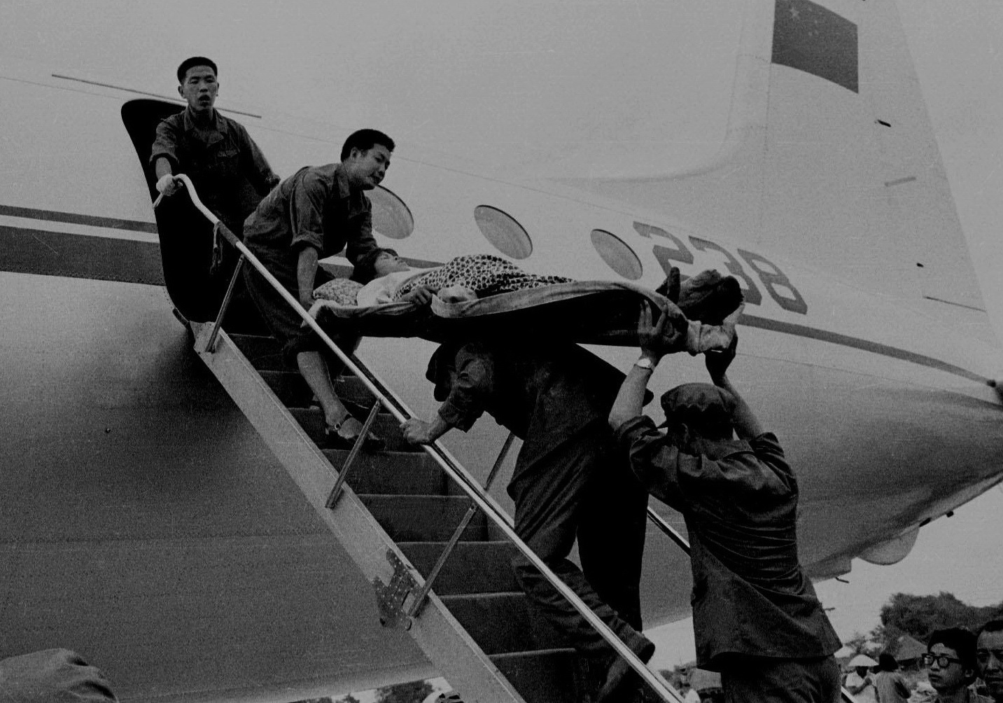1976年唐山大地震。唐山機(jī)場(chǎng),子弟兵護(hù)送重傷員。蔣鐸攝