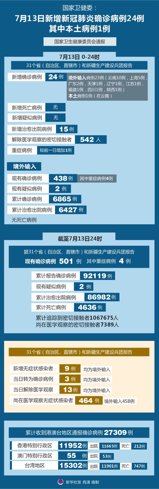 圖表:國(guó)家衛(wèi)健委:7月13日新增新冠肺炎確診病例24例 其中本土病例1例