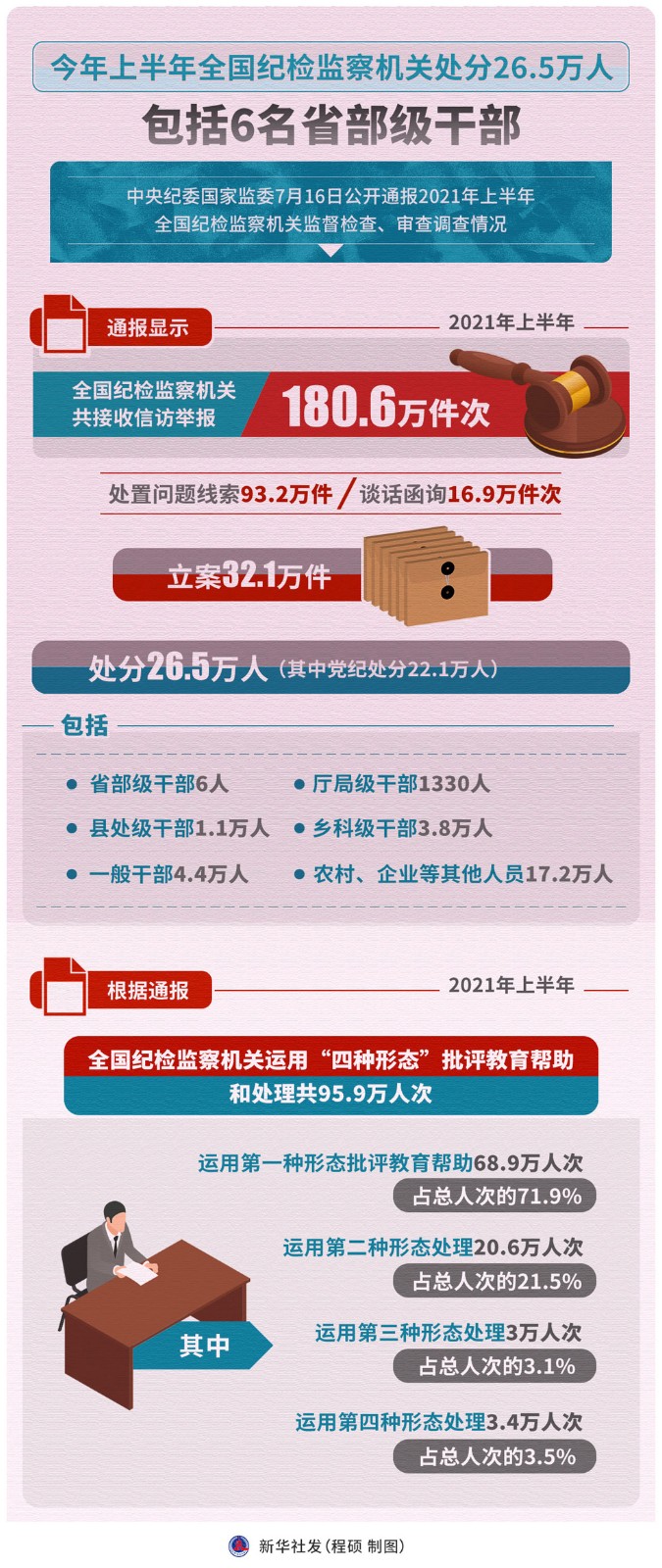 圖表:今年上半年全國紀(jì)檢監(jiān)察機(jī)關(guān)處分26.5萬人 包括6名省部級干部
