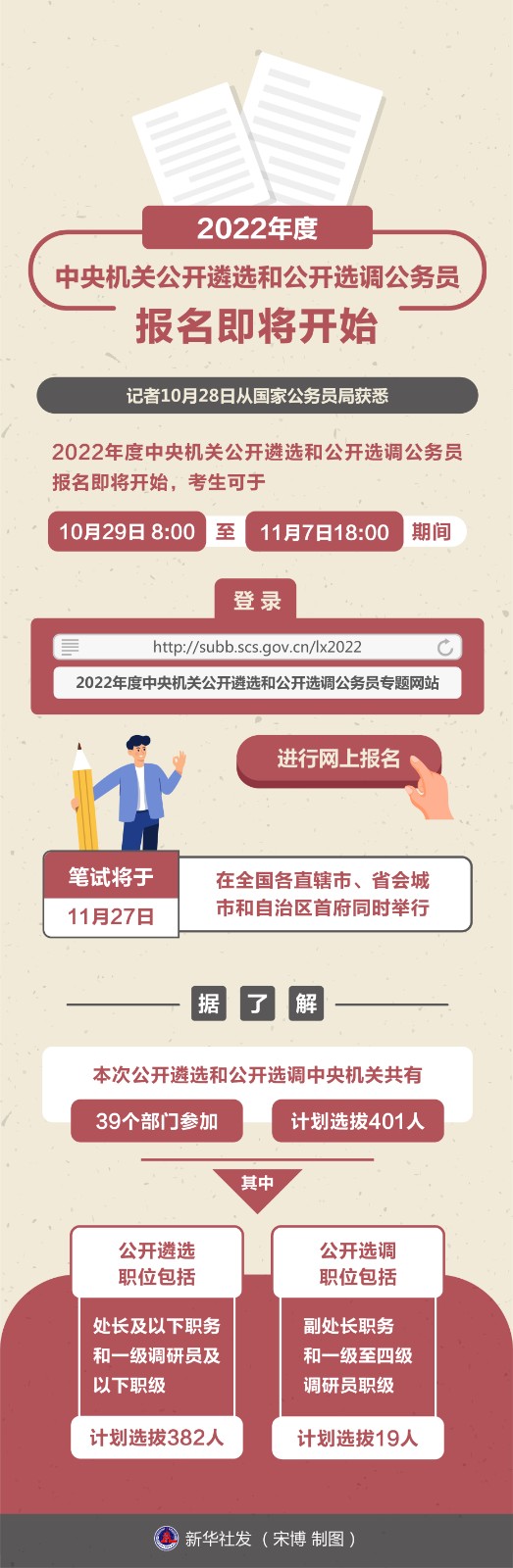 記者10月28日從國家公務員局獲悉,2022年度中央機關公開遴選和公開選調公務員報名即將開始,考生可于10月29日8:00至11月7日18:00期間,登錄“2022年度中央機關公開遴選和公開選調公務員專題網站”(http://subb.scs.gov.cn/lx2022)進行網上報名,筆試將于11月27日在全國各直轄市、省會城市和自治區(qū)首府同時舉行。