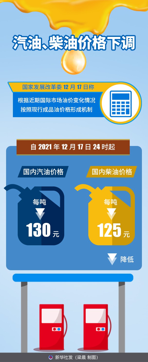 國家發(fā)展改革委12月17日稱,根據(jù)近期國際市場油價變化情況,按照現(xiàn)行成品油價格形成機制,自2021年12月17日24時起,國內(nèi)汽油、柴油價格每噸分別降低130元和125元。