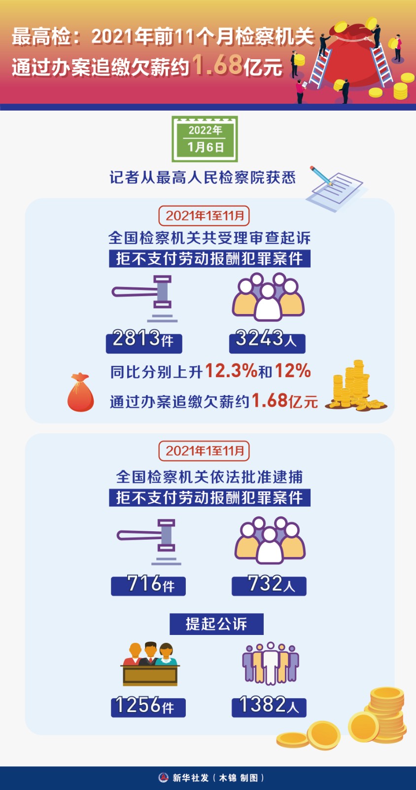 記者1月6日從最高人民檢察院獲悉,2021年1至11月,全國(guó)檢察機(jī)關(guān)共受理審查起訴拒不支付勞動(dòng)報(bào)酬犯罪案件2813件3243人,同比分別上升12.3%和12%,通過(guò)辦案追繳欠薪約1.68億元。