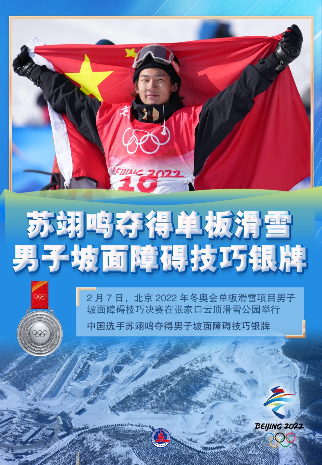 2月7日,北京2022年冬奧會(huì)單板滑雪項(xiàng)目男子坡面障礙技巧決賽在張家口云頂滑雪公園舉行。中國(guó)選手蘇翊鳴奪得男子坡面障礙技巧銀牌。