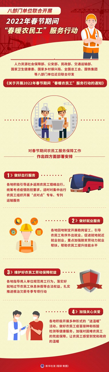 人力資源社會(huì)保障部、公安部、民政部、交通運(yùn)輸部、國(guó)家衛(wèi)生健康委、國(guó)家鄉(xiāng)村振興局、全國(guó)總工會(huì)、國(guó)鐵集團(tuán)等八部門單位近日聯(lián)合印發(fā)《關(guān)于開(kāi)展2022年春節(jié)期間“春暖農(nóng)民工”服務(wù)行動(dòng)的通知》,對(duì)春節(jié)期間農(nóng)民工服務(wù)保障工作作出四方面部署安排。