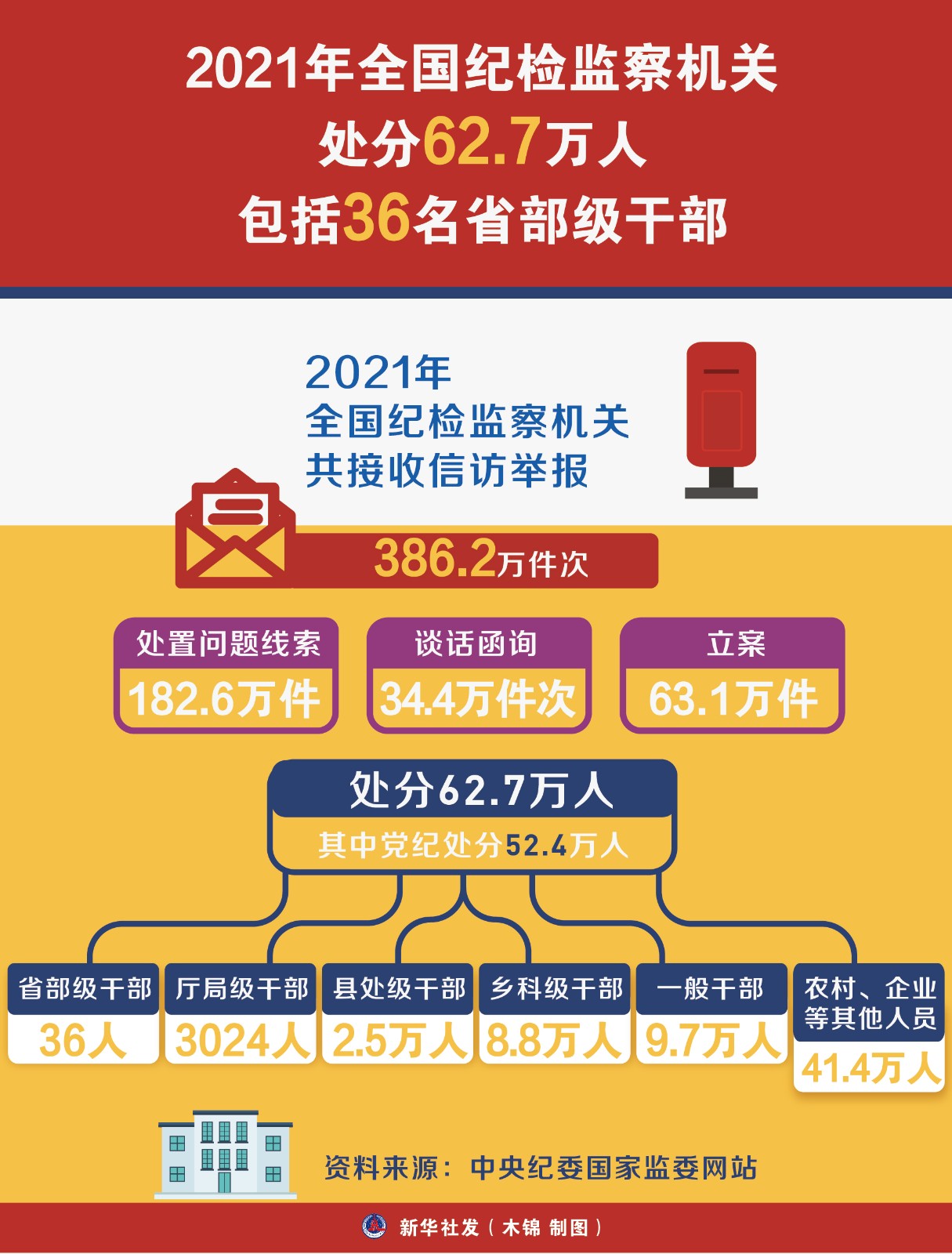 中央紀(jì)委國家監(jiān)委網(wǎng)站1月21日消息,中央紀(jì)委國家監(jiān)委通報2021年全國紀(jì)檢監(jiān)察機(jī)關(guān)監(jiān)督檢查審查調(diào)查情況。2021年,全國紀(jì)檢監(jiān)察機(jī)關(guān)共接收信訪舉報386.2萬件次,立案63.1萬件,處分62.7萬人,包括省部級干部36人,廳局級干部3024人。