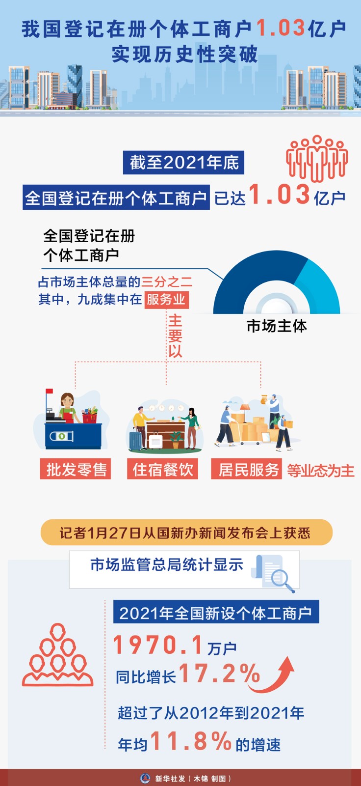 我國登記在冊個體工商戶邁上1億戶臺階,實現(xiàn)歷史性突破。截至2021年底,全國登記在冊個體工商戶已達1.03億戶,占市場主體總量的三分之二。其中,九成集中在服務業(yè),主要以批發(fā)零售、住宿餐飲和居民服務等業(yè)態(tài)為主。