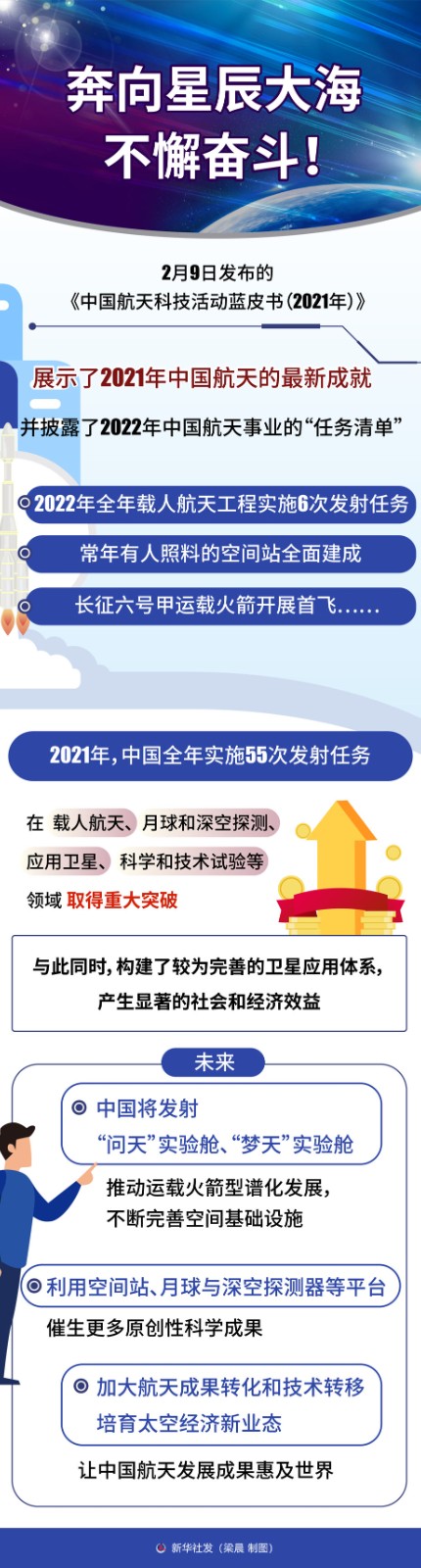 2022年全年載人航天工程實施6次發(fā)射任務,常年有人照料的空間站全面建成,長征六號甲運載火箭開展首飛……2月9日發(fā)布的《中國航天科技活動藍皮書(2021年)》,展示了2021年中國航天的最新成就,并披露了2022年中國航天事業(yè)的“任務清單”,一項項舉世矚目的成就和新計劃催人奮進。