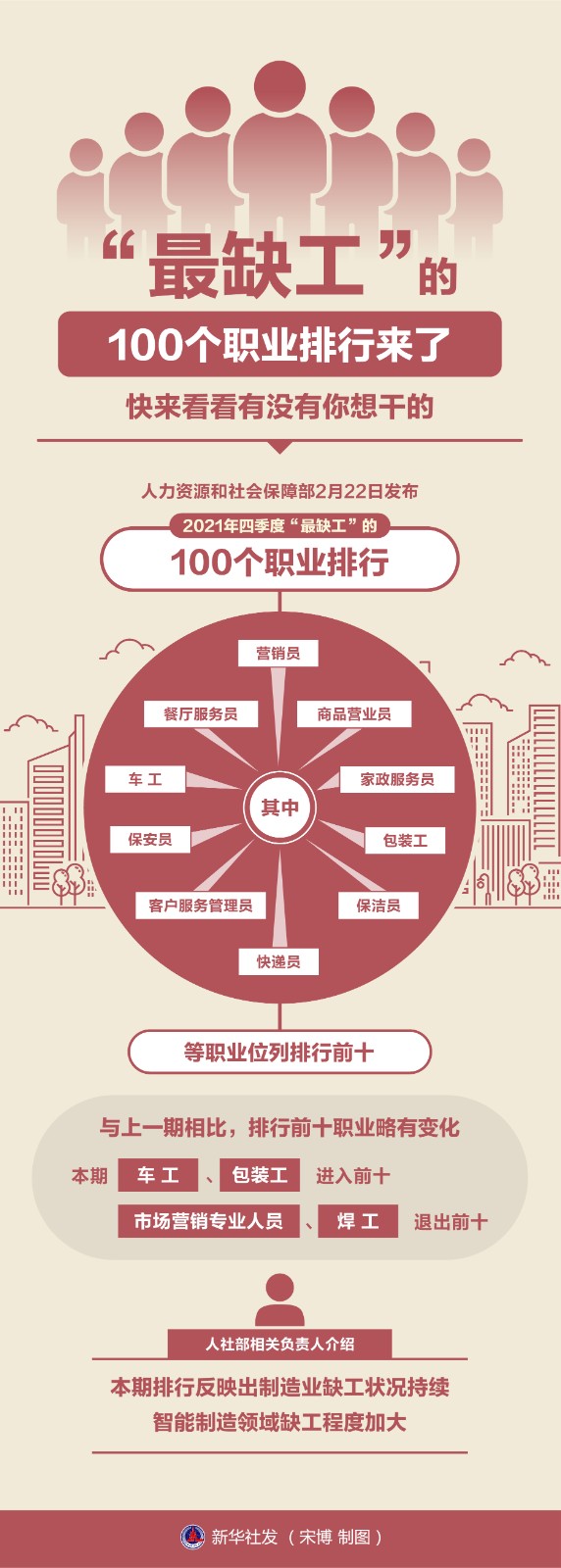 人力資源和社會保障部2月22日發(fā)布2021年四季度“最缺工”的100個職業(yè)排行,其中,營銷員、餐廳服務(wù)員、商品營業(yè)員、車工、家政服務(wù)員、保安員、包裝工、客戶服務(wù)管理員、保潔員、快遞員等職業(yè)位列排行前十。