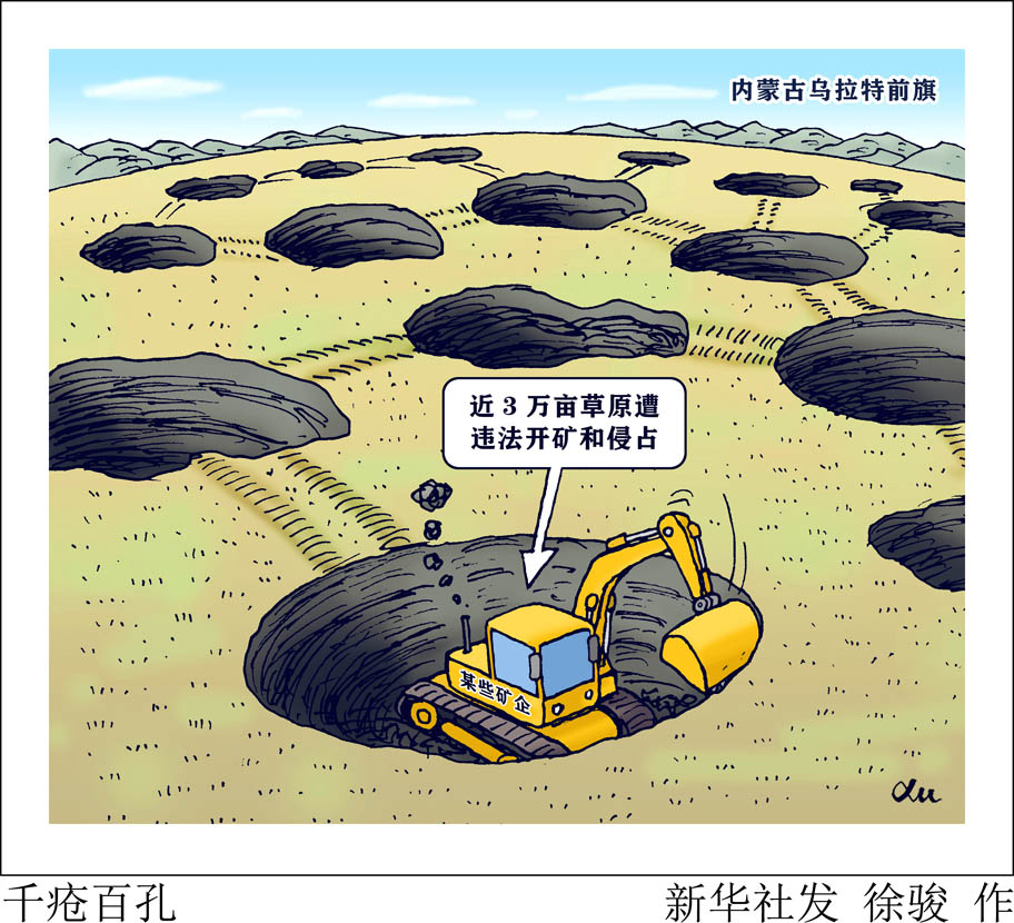 “新華視點”記者日前跟隨中央第三生態(tài)環(huán)境保護督察組督察發(fā)現(xiàn),內(nèi)蒙古自治區(qū)巴彥淖爾市烏拉特前旗礦山開采長期無序發(fā)展,近3萬畝草原遭違法開礦和侵占,使原本生態(tài)就脆弱的荒漠半荒漠草原遭受嚴(yán)重破壞。