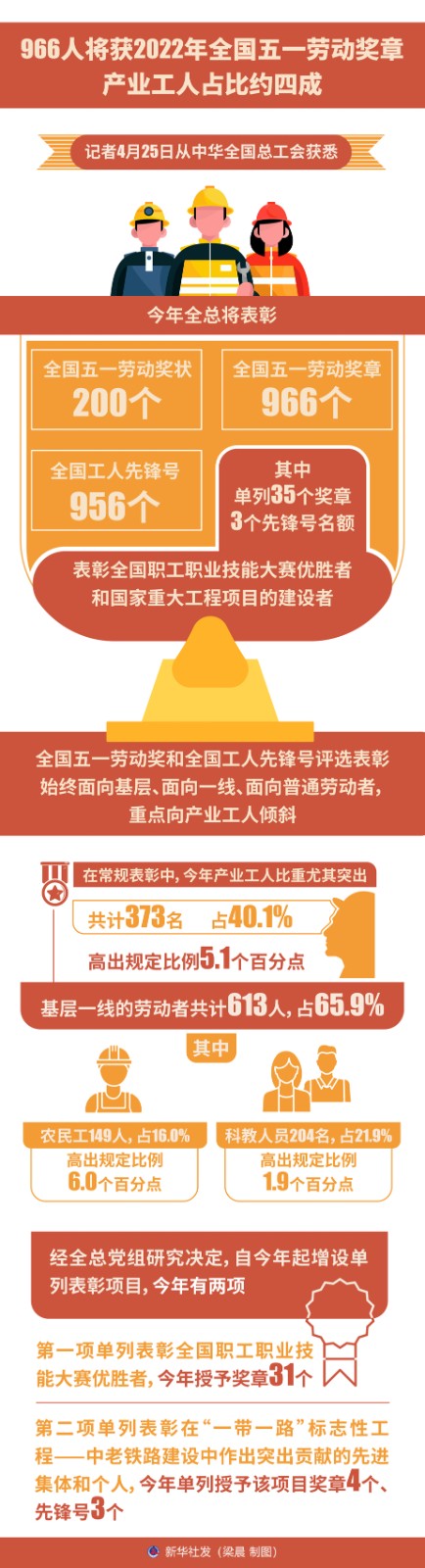 圖表:966人將獲2022年全國五一勞動獎?wù)?產(chǎn)業(yè)工人占比約四成