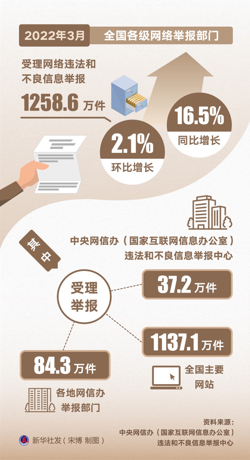 中央網(wǎng)信辦(國家互聯(lián)網(wǎng)信息辦公室)違法和不良信息舉報中心近日公布的統(tǒng)計數(shù)據(jù)顯示,今年3月,全國各級網(wǎng)絡(luò)舉報部門受理舉報1258.6萬件,環(huán)比增長2.1%、同比增長16.5%。