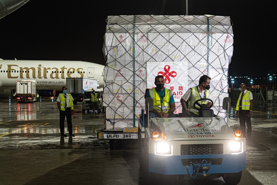 6月3日,在斯里蘭卡科倫坡班達(dá)拉奈克國際機場,工作人員搬運中國援助的緊急人道主義藥品。