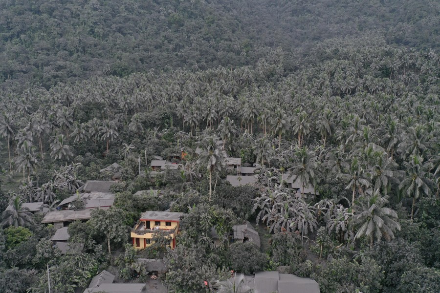 6月5日,菲律賓索索貢省的一個(gè)城鎮(zhèn)被布盧?;鹕絿姲l(fā)的火山灰覆蓋(無人機(jī)照片)。
