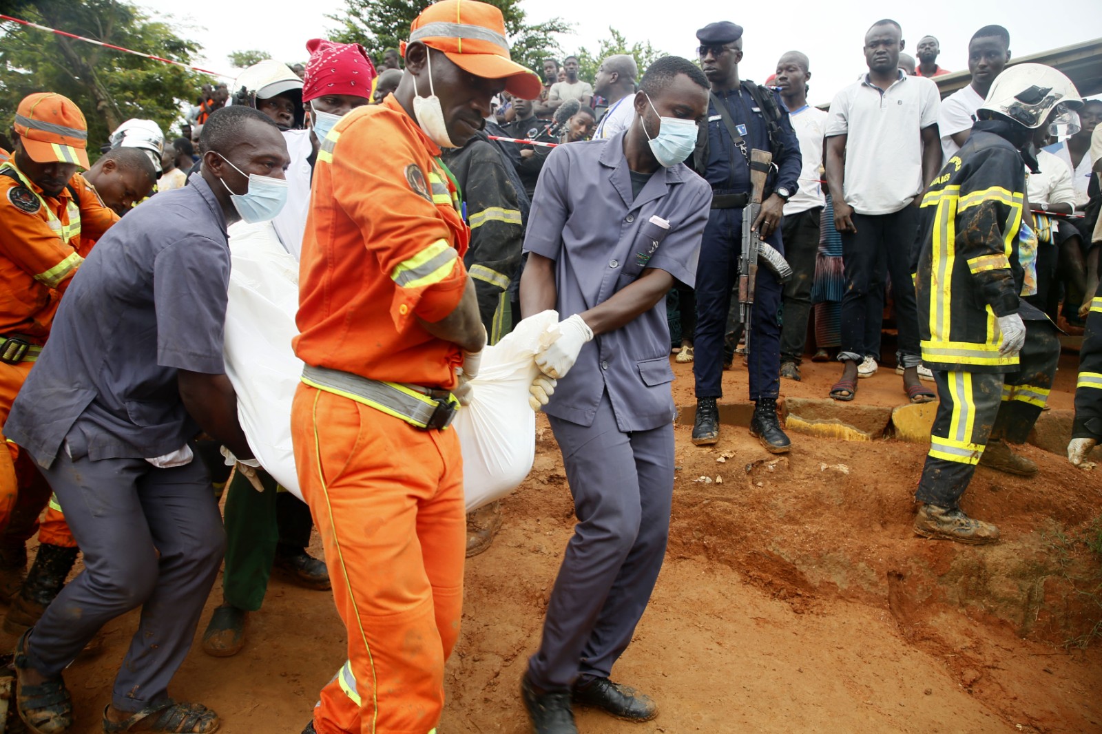 6月16日,在科特迪瓦阿比讓,救援人員搬運滑坡事故遇難者遺體。