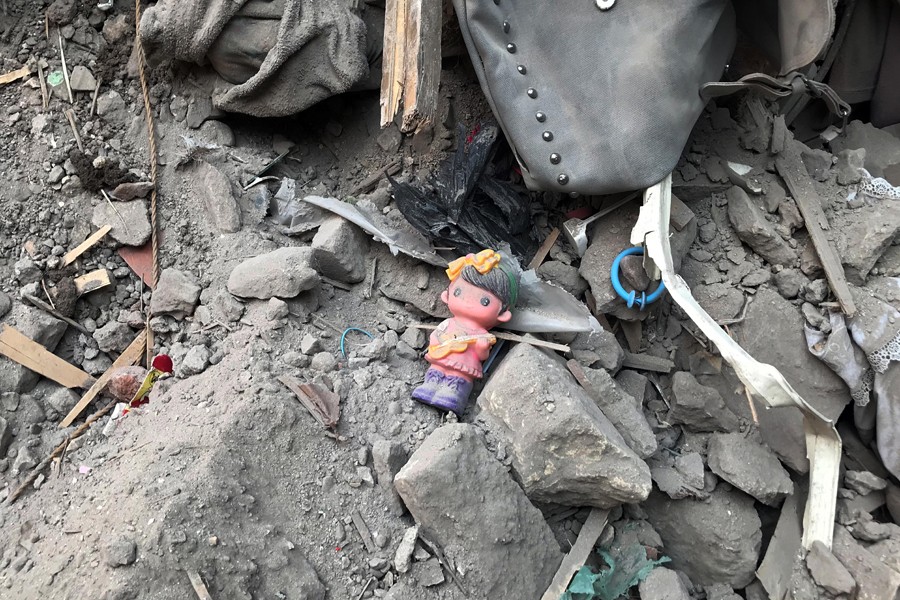 這是6月17日在埃及首都開(kāi)羅樓房倒塌現(xiàn)場(chǎng)拍攝的廢墟中的玩偶。