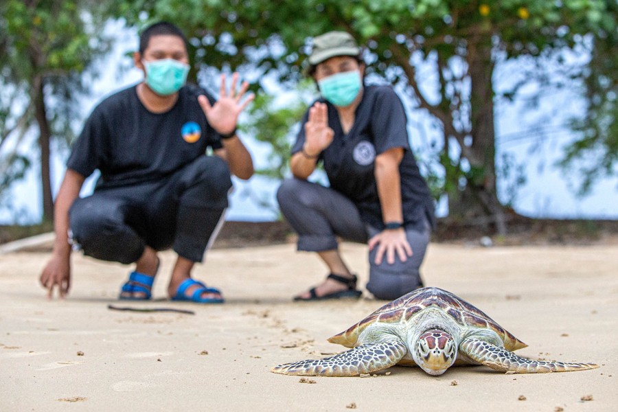 6月21日,在泰國羅勇府蒙奈島海龜保護(hù)中心,南塔日卡博士(右)和同事將海龜放歸自然。