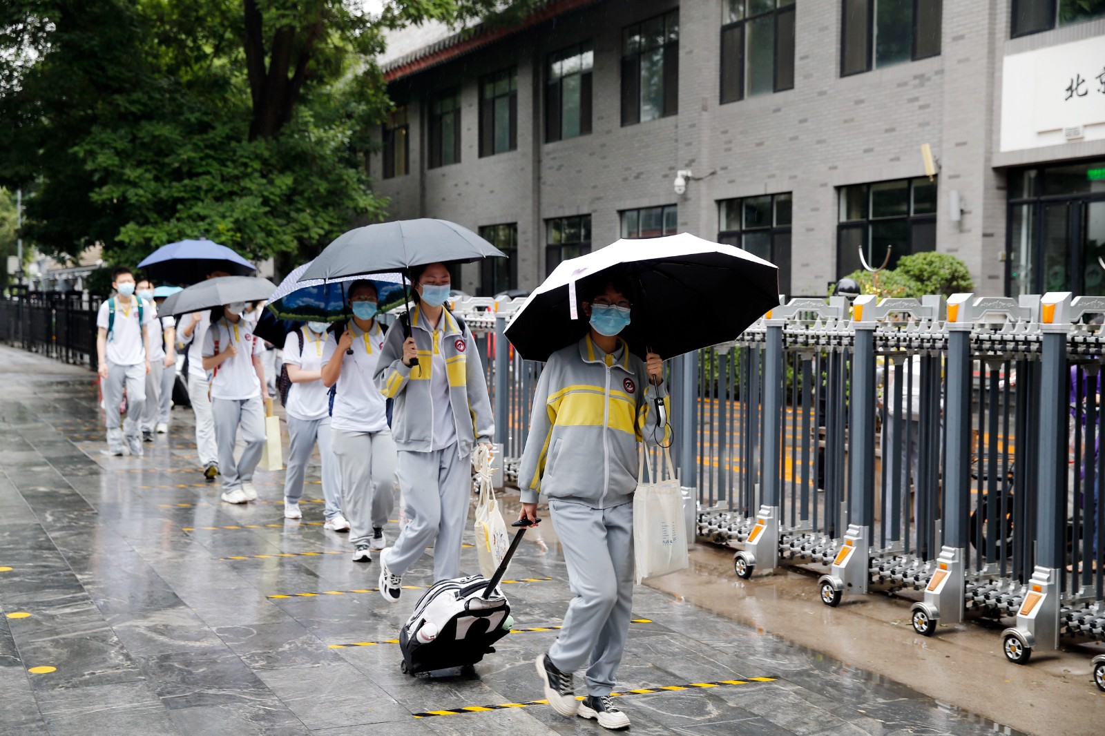 6月27日,北京二中學(xué)生在出示健康碼、接受體溫檢測(cè)后按照指定通道進(jìn)入校園。