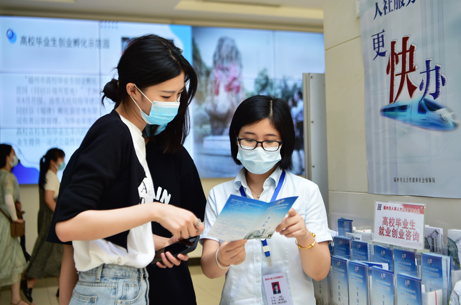 在福州市人事人才公共服務(wù)中心,集美大學(xué)誠(chéng)毅學(xué)院的一名畢業(yè)生(前左)向工作人員咨詢1萬(wàn)元一次性生活補(bǔ)貼的申報(bào)領(lǐng)取手續(xù)(6月29日攝)。