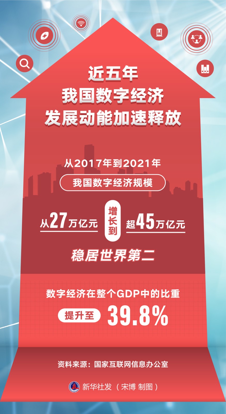 “從2017年到2021年,我國數(shù)字經(jīng)濟規(guī)模從27萬億元增長到超45萬億元,穩(wěn)居世界第二。數(shù)字經(jīng)濟在整個GDP中的比重提升至39.8%?!眹一ヂ?lián)網(wǎng)信息辦公室副主任曹淑敏7月5日在第五屆數(shù)字中國建設(shè)峰會新聞發(fā)布會上表示,黨的十九大以來,數(shù)字經(jīng)濟發(fā)展動能加速釋放。
